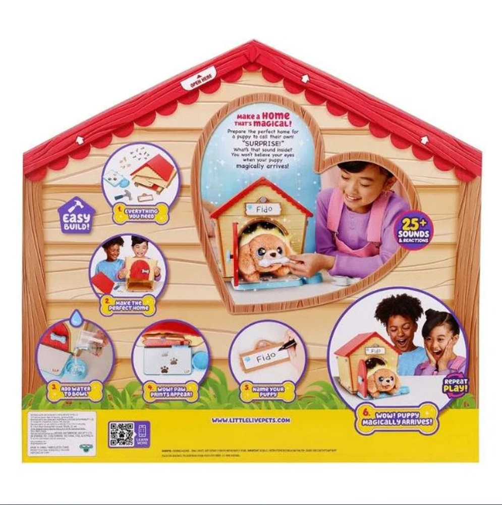 Little Live Pets Casa dos Filhotes.My Puppy's Home vem como um pacote plano com todas as ferramentas e peças que seu filho precisa para construir uma linda casinha de cachorro. Depois que as paredes e o teto estiverem montados, é hora de estender o tapete de boas-vindas e encher a tigela de água do filhote. As crianças ficarão maravilhadas quando virem pegadas fofas aparecerem magicamente no tapete! Agora é hora da verdadeira surpresa acontecer. O que é esse som vindo de dentro? Abra a porta! Uau! Um lindo cachorrinho de estimação apareceu do nada para seu filho brincar! Este doce cachorrinho é tão brincalhão