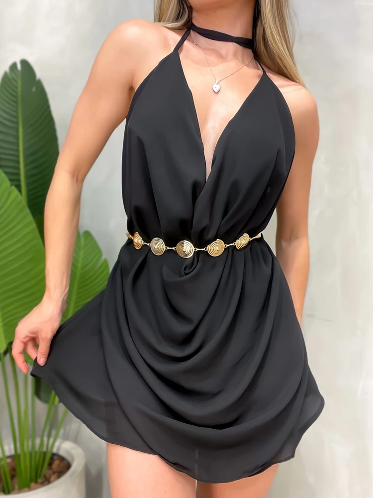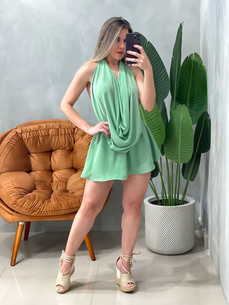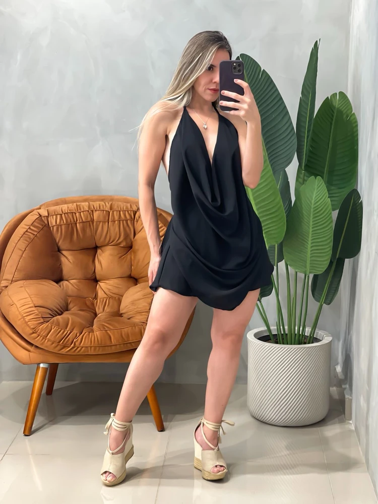 Palavras-chave: vestido curto crepe, vestido decote profundo, vestido halter, vestido elegante, vestido para festa.
