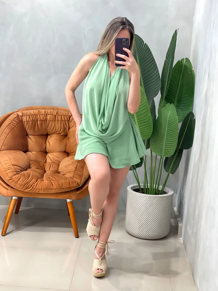 Vestido curto em crepe com design sofisticado e decote profundo, ideal para eventos especiais e ocasiões que pedem um toque de elegância e sensualidade. A peça valoriza o corpo com caimento fluido e ajuste confortável, perfeito para quem busca estilo aliado ao conforto. O detalhe da gola halter cria uma silhueta moderna e feminina, destacando o colo com delicadeza. Feito em tecido leve, é ideal para noites quentes e encontros marcantes, proporcionando liberdade de movimento e sensação agradável ao vestir. Garanta um visual único e marcante com esta peça que une charme e versatilidade.