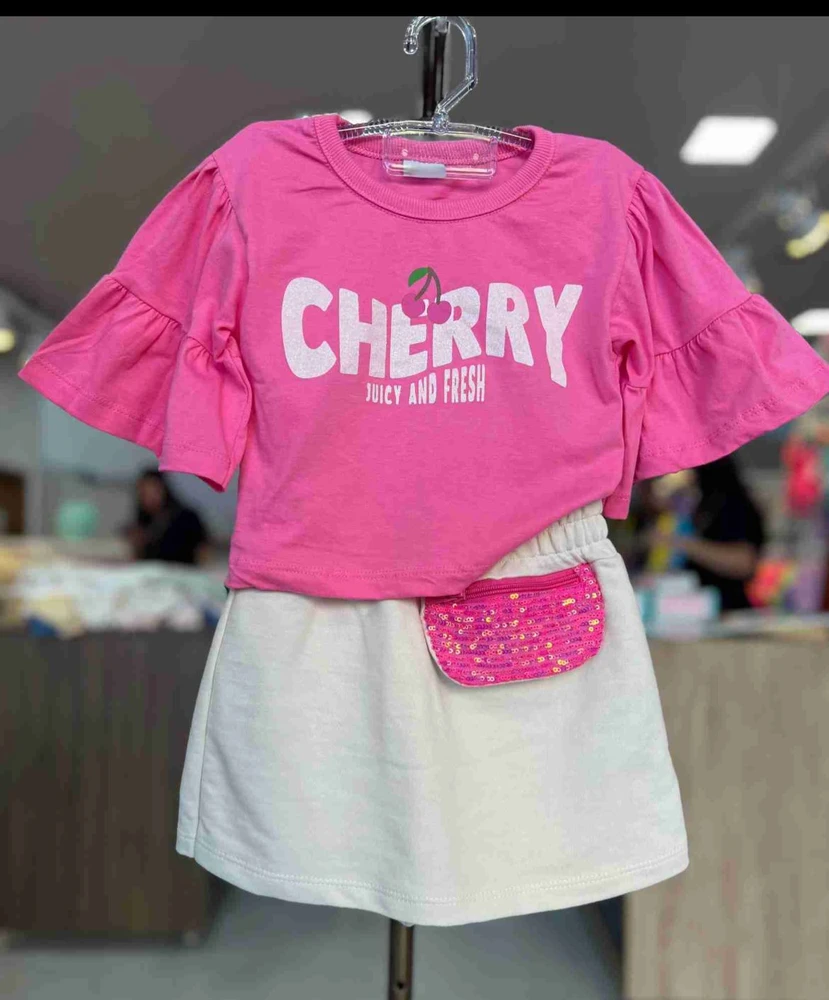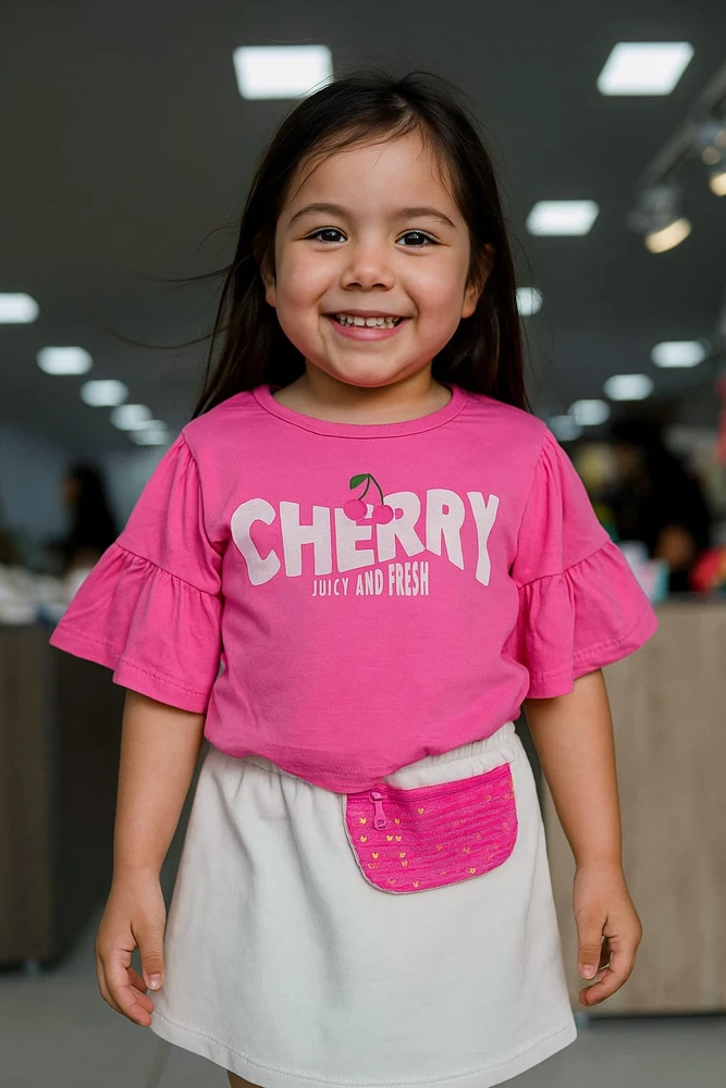 Conjunto infantil composto por blusa rosa com estampa divertida "CHERRY" e shorts saia bege com detalhe em rosa, perfeito para meninas nos tamanhos 8 e 10. Desenvolvido para proporcionar conforto e estilo, o tecido macio garante liberdade de movimento nas brincadeiras do dia a dia. A blusa apresenta mangas bufantes que adicionam charme e delicadeza ao visual, enquanto a saia com bolsinho frontal em tecido bordado oferece um toque único e moderno. Ideal para ocasiões casuais e passeios, este conjunto une praticidade e elegância, conquistando mães que buscam qualidade e design diferenciado para suas filhas.