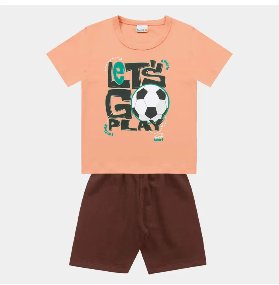 Conjunto Fakini infantil com camiseta laranja e shorts marrom, perfeito para crianças de 3 a 8 anos que adoram brincar e praticar esportes. A camiseta traz estampa divertida com tema futebol, estimulando a energia e a diversão dos pequenos. Confeccionado em tecido macio e resistente, garante conforto e liberdade de movimento durante o dia a dia. Ideal para momentos de lazer, passeios e atividades ao ar livre, o conjunto alia estilo e praticidade em uma combinação versátil.