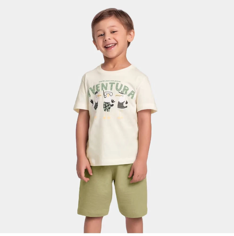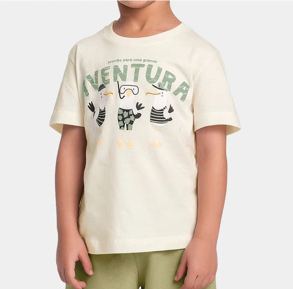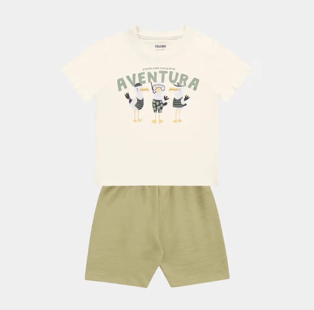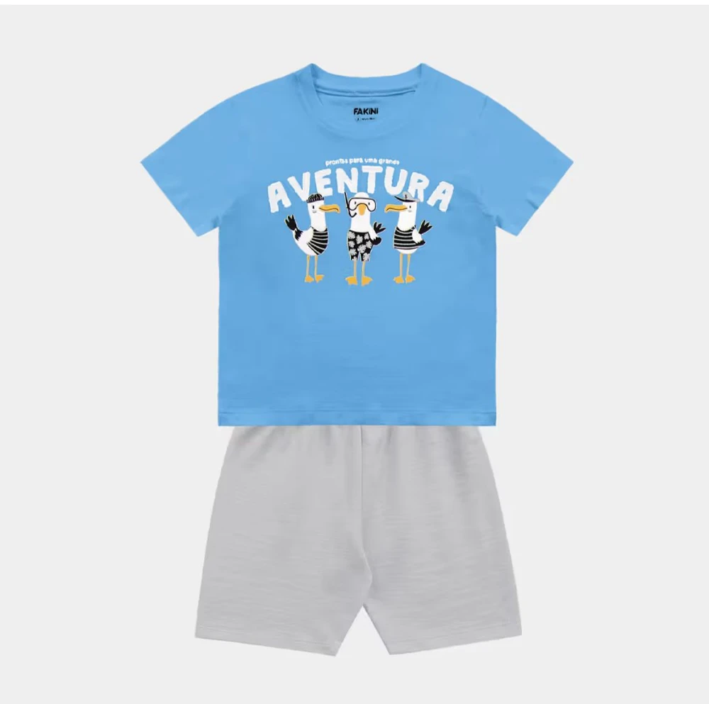 Descubra o Conjunto Fakini tamanho 1, 2 e 3, ideal para crianças cheias de energia e vontade de explorar. Com camiseta azul vibrante estampada com aves divertidas e a palavra "Aventura", este conjunto inspira momentos de diversão e descobertas. A bermuda cinza clara, feita em tecido leve e confortável, garante liberdade de movimento para que os pequenos possam brincar sem restrições.