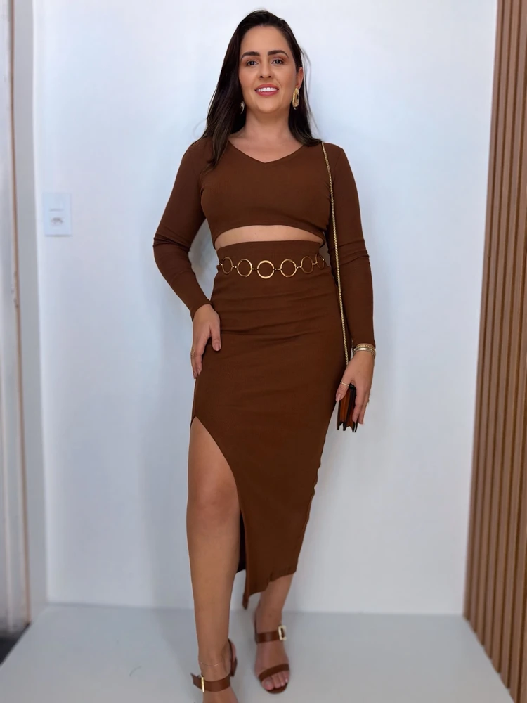 O Conjunto Isabela é a escolha perfeita para quem busca um look elegante, moderno e marcante. Composto por cropped de manga longa e saia longa justa, ele valoriza a silhueta e traz sofisticação na medida certa.