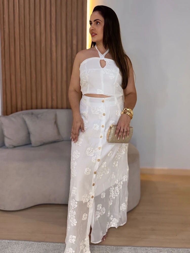 Esse conjunto é aquele look que te deixa arrumada sem esforço. Ele é fresquinho, elegante e te acompanha do almoço com as amigas ao jantar à beira-mar. O floral é clássico, mas com personalidade — e os botões dourados dão o toque final de charme.