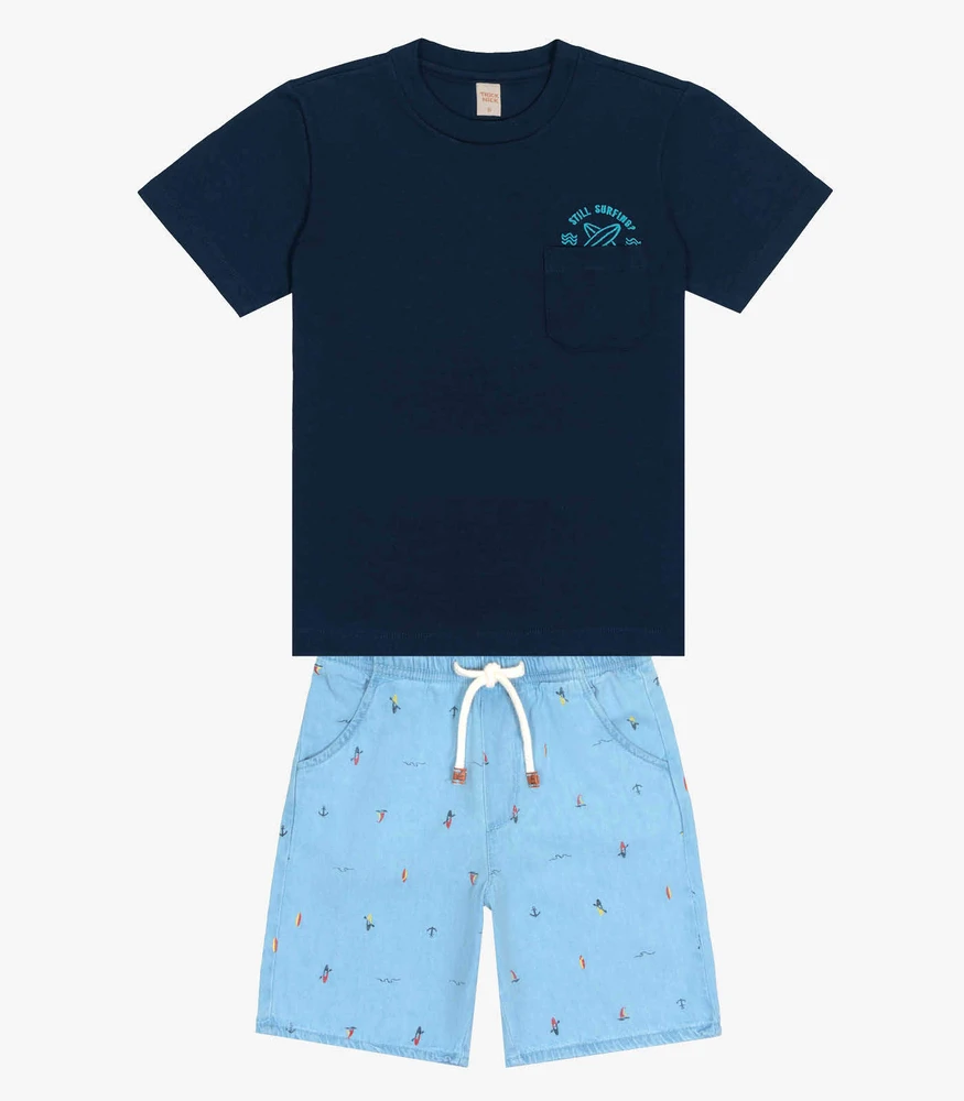 Combinando conforto e estilo, esse conjunto traz uma camiseta macia, que garante frescor e liberdade de movimentos, ideal para crianças ativas. A bermuda em tecido denim claro, estampada com motivos divertidos, acrescenta um toque moderno e alegre ao visual. A camiseta possui decote em ribana e bolso, adicionando detalhes charmosos ao visual. A bermuda, com cós elástico e cadarço funcional, oferece ajuste perfeito, enquanto o bolso embutido garante praticidade.Pensado para oferecer durabilidade e resistência, o conjunto é uma escolha prática para momentos de lazer e passeios.