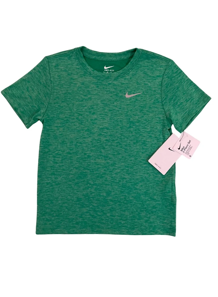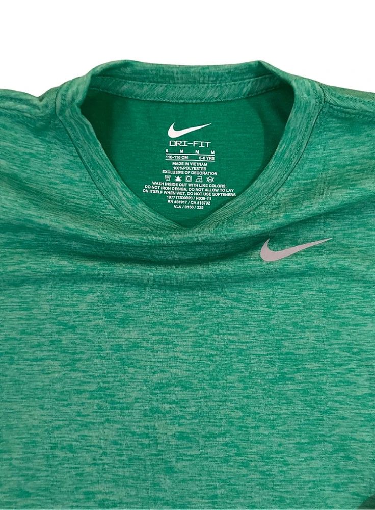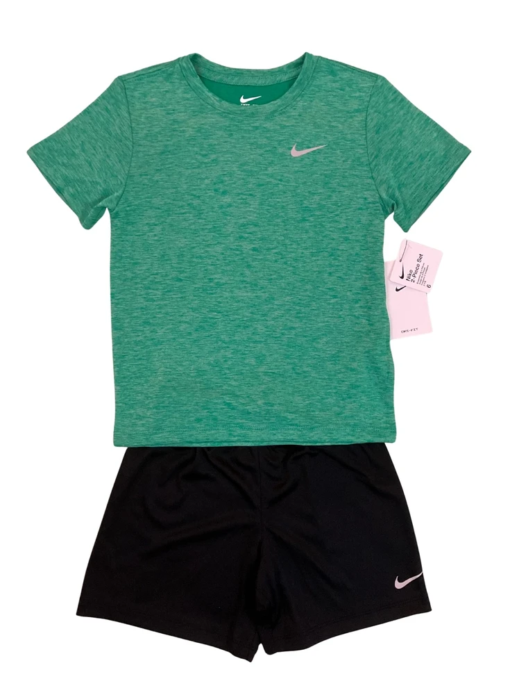Conjunto Infantil Dri-Fit Nike: conforto e tecnologia para os pequenos que adoram se manter ativos. Feito com tecido Dri-Fit, esse conjunto garante máxima respirabilidade e rápida absorção do suor, mantendo a pele seca mesmo durante as brincadeiras mais intensas. A camiseta verde com design moderno e a bermuda preta básica com cós elástico, ambas com o icônico logo Nike, proporcionam liberdade de movimento e estilo esportivo autêntico.