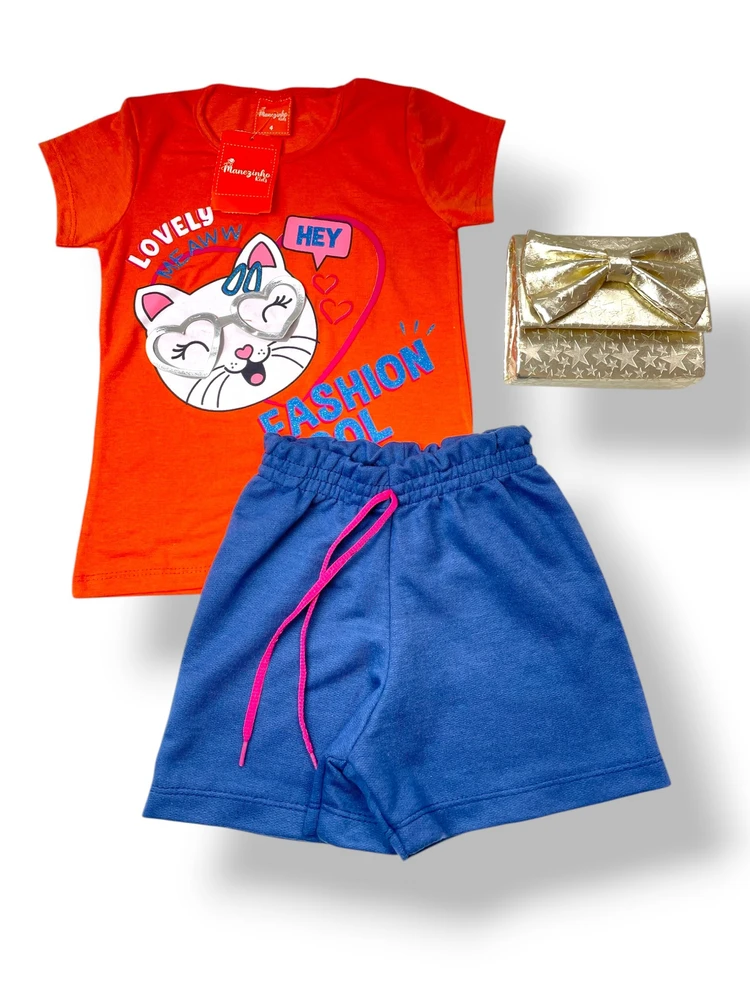 A blusa em tom vibrante de laranja traz uma estampa fofa de gatinha fashion com óculos e frases divertidas que encantam qualquer criança. O short azul com cordão rosa neon completa o visual com um toque moderno e cheio de energia.