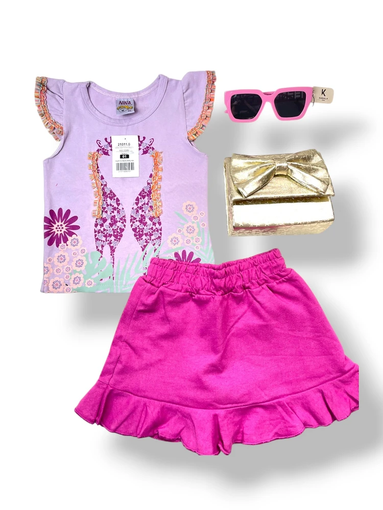 Composto por uma blusa lilás com estampa de girafas floridas e babadinhos nas mangas, e um short pink com babado na barra, esse look é perfeito para deixar as pequenas confortáveis e estilosas em qualquer ocasião.