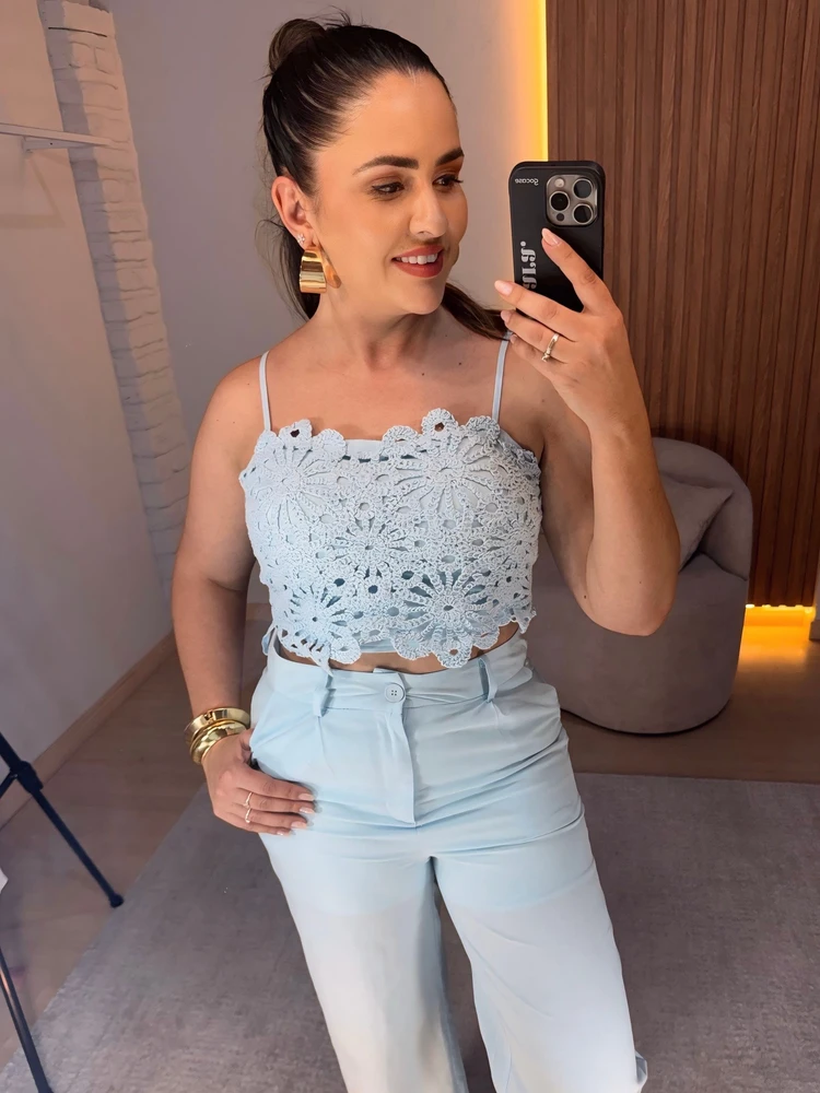 O Conjunto Lívia com Cropped de Renda Floral e Calça Alfaiatada é a escolha ideal para quem busca um visual elegante, moderno e marcante. A combinação une a delicadeza da renda trabalhada ao caimento sofisticado da alfaiataria, criando um look equilibrado entre romantismo e imponência.