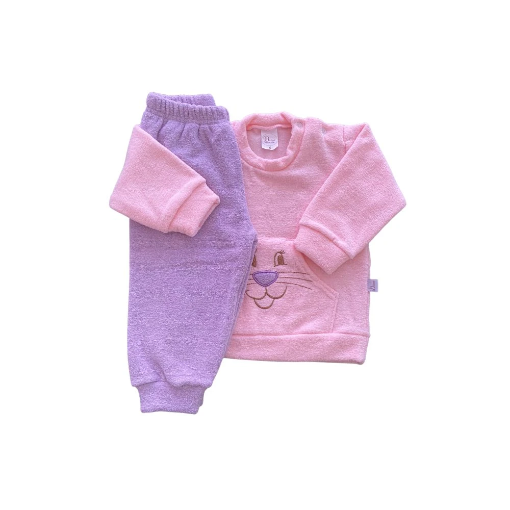 Conjunto longo para bebê soft brush com bordado gatinha Rosa Bebê