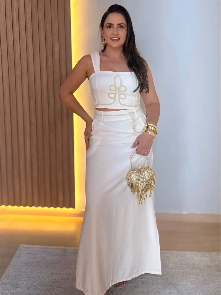 O Conjunto Lua é a escolha perfeita para quem busca elegância com um toque de leveza e modernidade. Composto por uma saia longa reta e um cropped estruturado, esse conjunto une sofisticação e frescor em uma produção charmosa e atemporal.