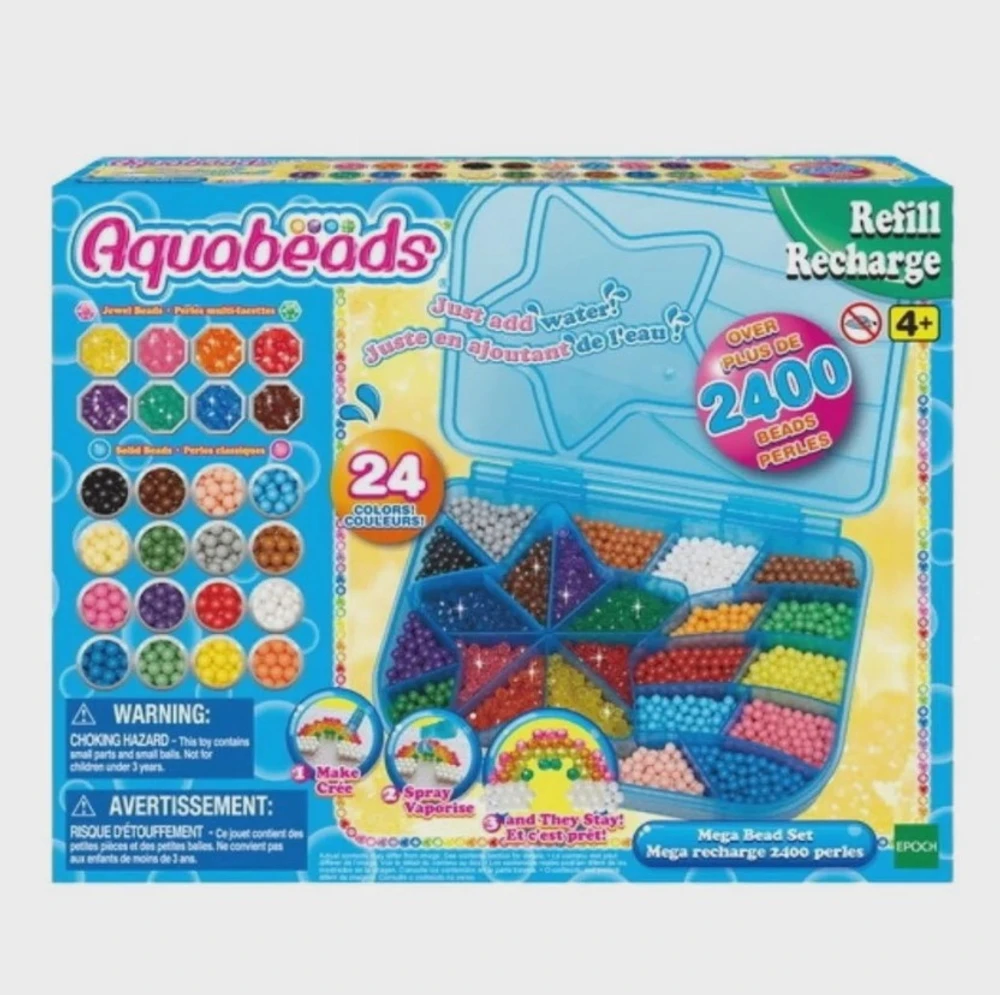 Divirta-se muito com o mega pacote de contas. Contendo 2.400 contas em 24 núcleos, este conjunto criativo permitirá fazer desenhos com mega imaginação. Completo com jóias e contas sólidas, você guarda facilmente este conjunto no estojo de contas estrela cadente e carrega com você. Aquabeads são os bons brinquedos de arte e artesanato para crianças. Fácil de usar, você apenas faz o design em uma bandeja de layout, borrifa com água e depois espera que ele se ajuste para que você possa manter os designs para sempre.