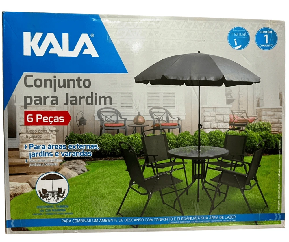 Descrição: Conjunto 6 peças de Mesa e Cadeiras e Guarda-sol KALA, ideal para áreas de lazer ao ar livre.
