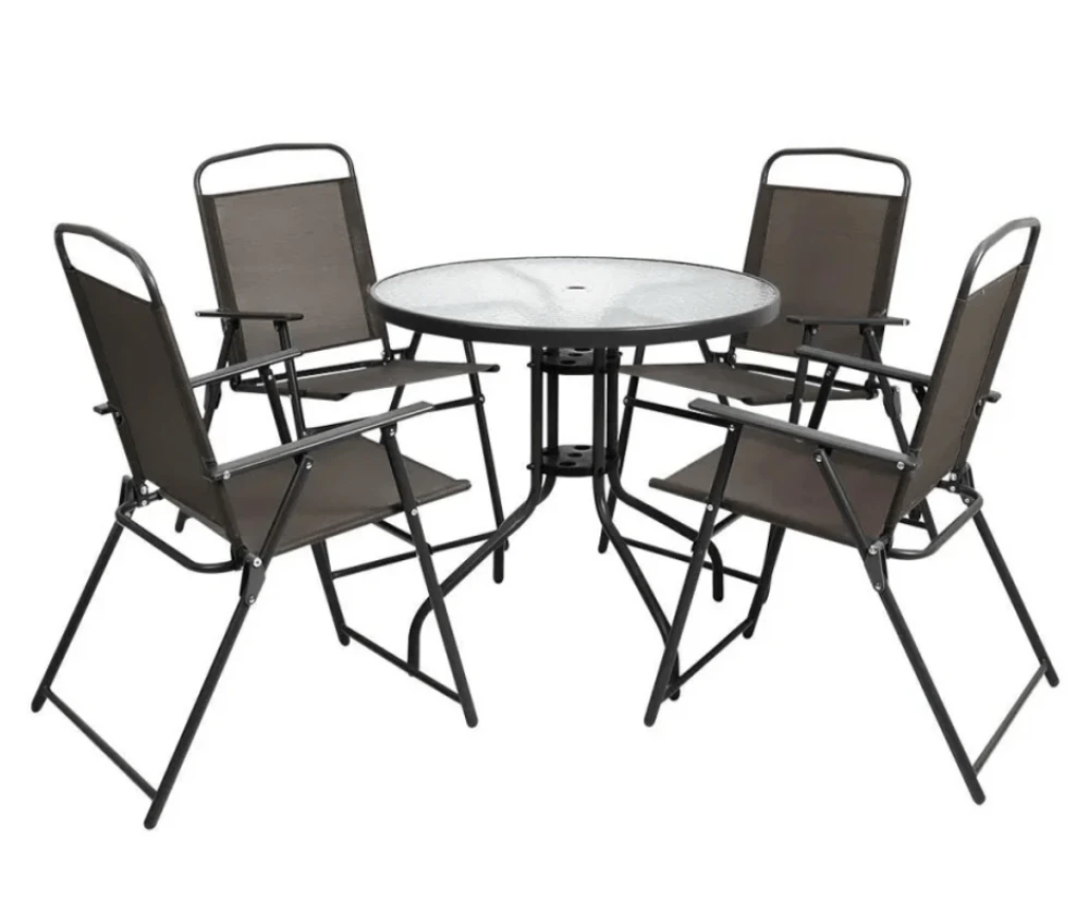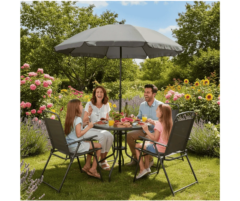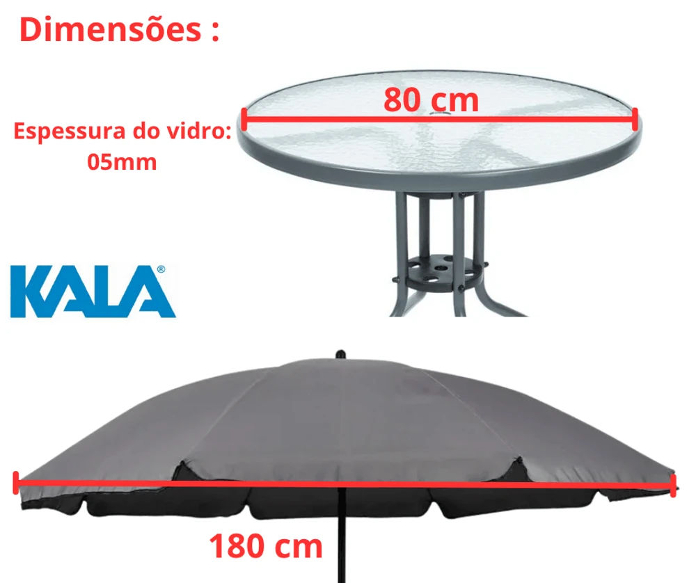 A mesa de centro quadrada, com estrutura em aço e tampo de vidro temperado de 5mm, é robusta, durável e fácil de limpar, sendo ideal para refeições ao ar livre ou momentos de relaxamento. O ombrelone articulado de 1,80m oferece uma sombra refrescante nos dias quentes de verão, proporcionando conforto sob o sol. As quatro cadeiras individuais dobráveis, com estrutura em aço e assento em textilene, são confortáveis, leves e ideais para entretenimento e relaxamento.