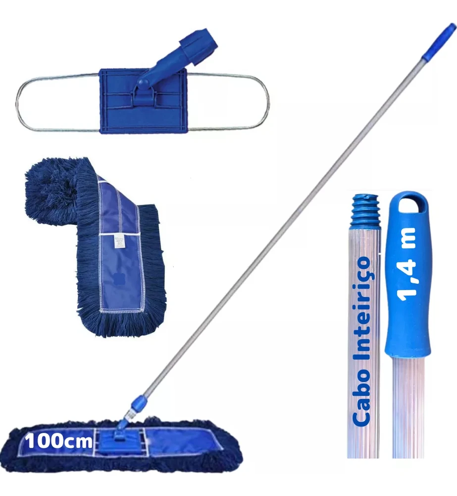 O Conjunto Mop Pó Limpeza Seca Starclean 100 cm é composto por:1 Armação;1 Refil de fios sintéticos ;1 Cabo de alumínio com diâmetro de 24mm.Medidas:Cabo Comprimento de 1,40Conjunto - 100cmARMAÇÃO:Produzida em polipropileno de alta resistência com estrutura em aço galvanizado.Para fixação do refil mop pó, suporta as mais variadas situações de trabalho proporcionando excelente durabilidade.Seu sistema de cabos com angulação aumentam a produtividade além de permitir a limpeza em locais de difícil acesso.CABO:Fabricado em alumínio anodizado.Oferece excelente durabilidade e ergonomia ideal, pois permitem ao operador manter a postura ereta.Pode ser facilmente higienizado.REFIL MOP PÓ:Produzido com fios sintéticos que durante a limpeza geram estática recolhendo todo o pó e sujeira.Seu desenho retangular e plano auxilia na limpeza, sendo possível alcançar os cantos e em baixo de móveis.Benefícios:A altura de 1,40 m favorece a postura correta do operador, otimiza a produtividade e evita danos a saúdeEvita a utilização de cabos de madeira que absorvem umidade e favorecem o aparecimento de germes e bactérias, além de apodrecerem com maior rapidez.Instruções de uso:Verificar sempre se a superfície a ser limpa não está úmida.Começar a limpeza do piso sempre paralelamente a uma das paredes e conduzir o mop para frente até o final da mesma.Retornar com o mop paralelamente ao local que foi passado sempre o conduzindo para frente sem levantá-lo do chão.