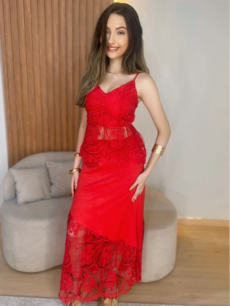 A blusa apresenta acabamento rendado detalhado, criando um visual leve, feminino e extremamente elegante. O trabalho da renda adiciona textura e charme à peça, enquanto a modelagem proporciona um caimento confortável e bem estruturado no corpo. A saia midi completa o conjunto com um corte clássico e elegante, garantindo movimento, fluidez e um visual equilibrado.