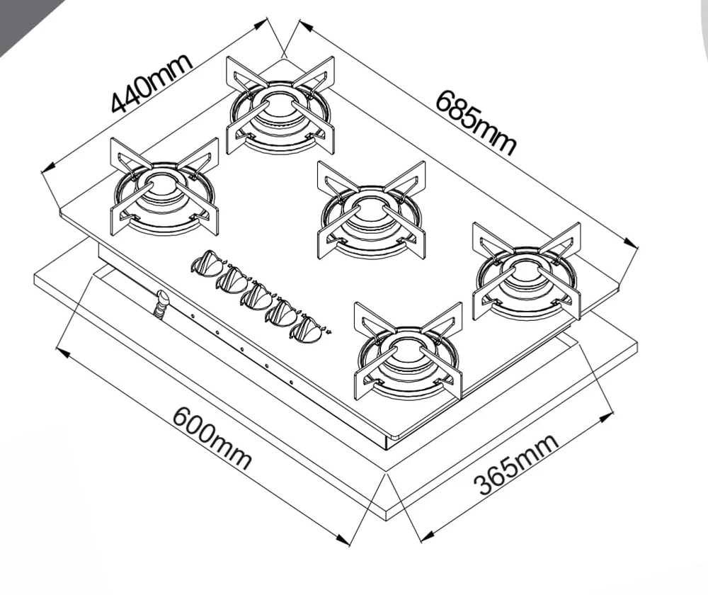 4 queimadores semi-rápidos de 1750W para cozimento eficiente. 1 queimador ultra rápido de 2200W, perfeito para instalações que desligam maior potência.