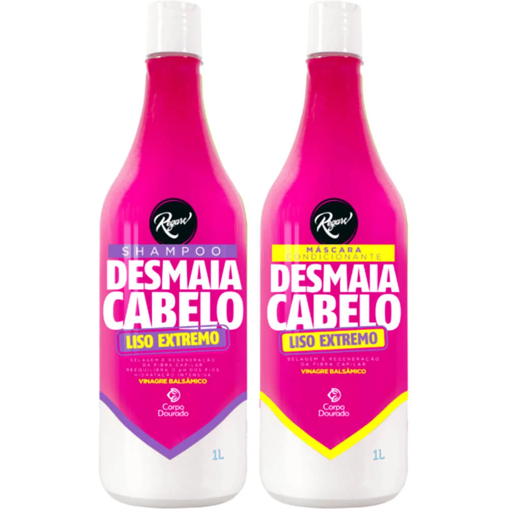 O Kit Desmaia Cabelo Regarv da Corpo Dourado possui fórmula com ativos que não agridem os fios e auxiliam na regeneração da fibra capilar. Rica em Vinagre Balsâmico, Lanolina e Silicones; auxilia no controle do volume, frizz e alinhamento dos cabelos.