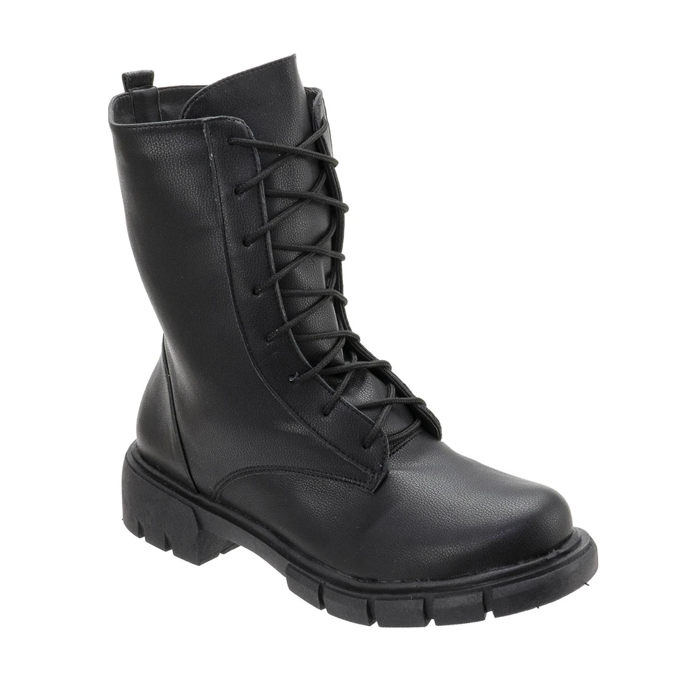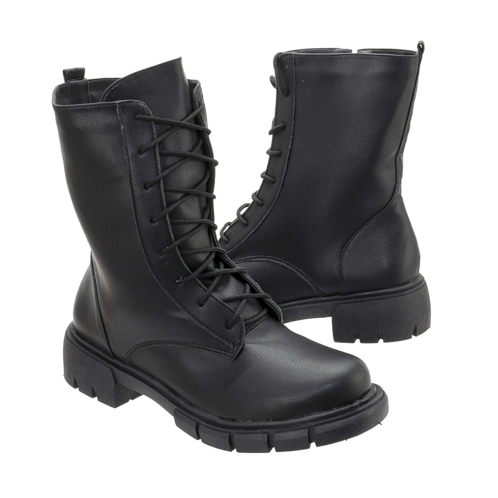 Bota em laminado sintético cano alto de 42 cm de altura com saltinho de 4,5 cm de altura e 47,5 cm de diâmetro na panturrilha.