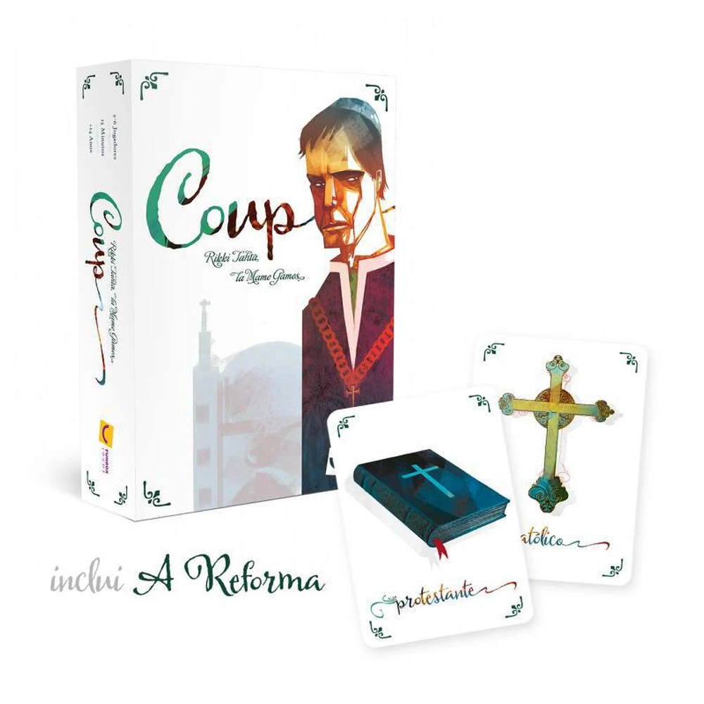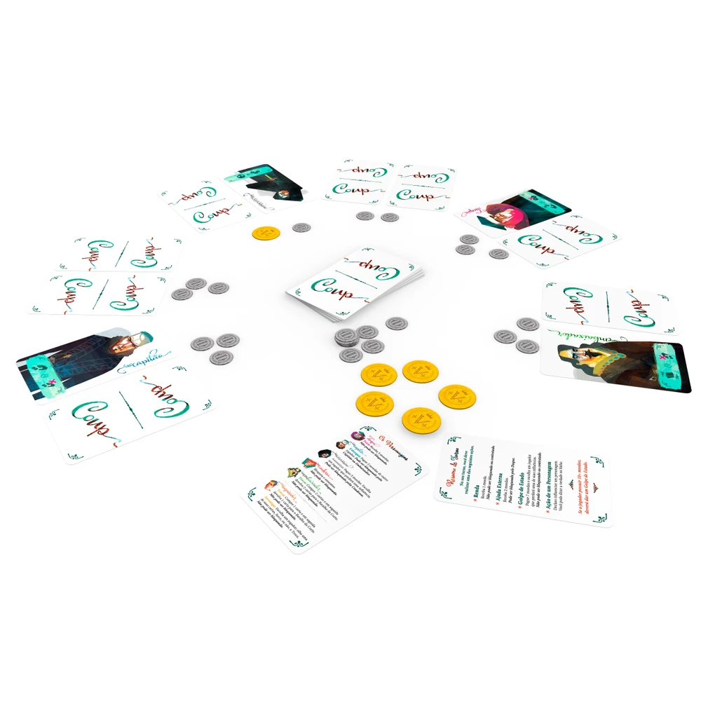 Cada jogador começa com duas moedas e duas influências. O baralho possui quinze cartas com três cópias de cinco personagens diferentes, cada um com suas próprias habilidades: