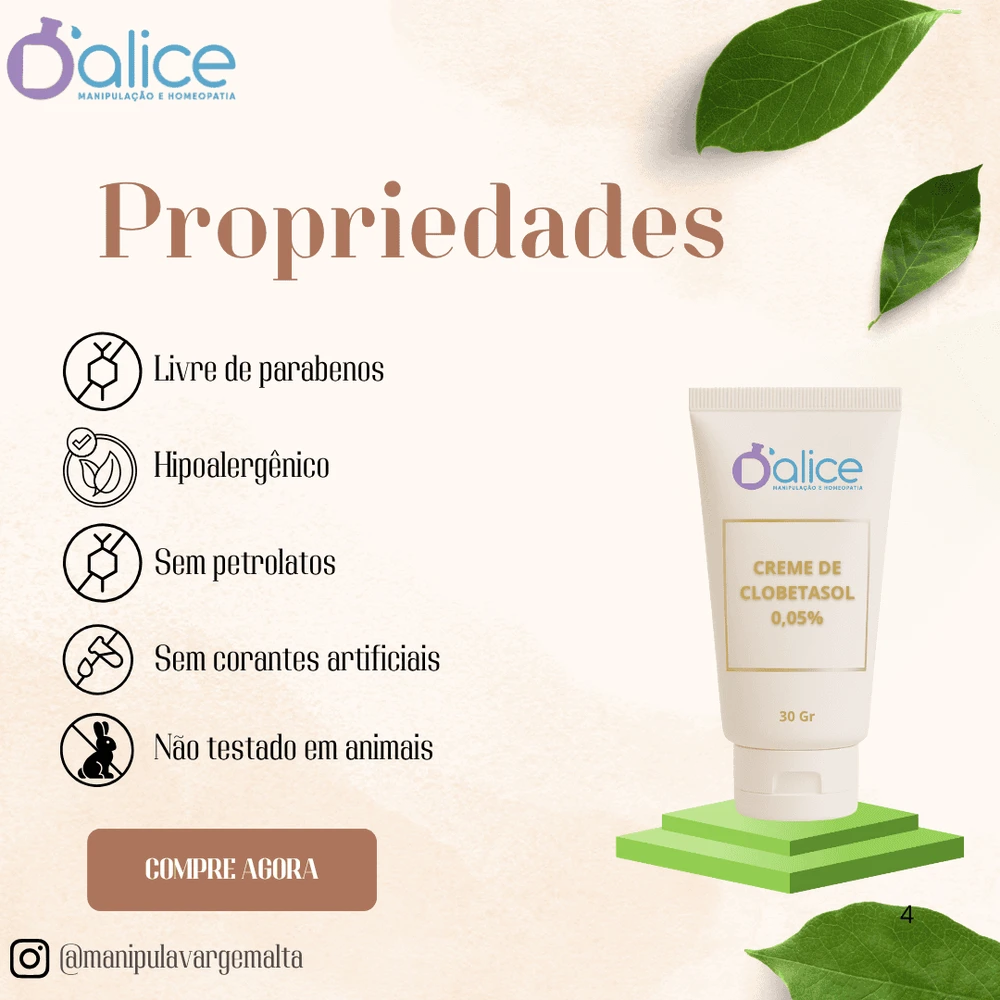 O Creme de Clobetasol 0,05% contém propionato de clobetasol, um corticosteroide sintético classificado como superpotente, com propriedades anti-inflamatórias, antipruriginosas e vasoconstritoras.