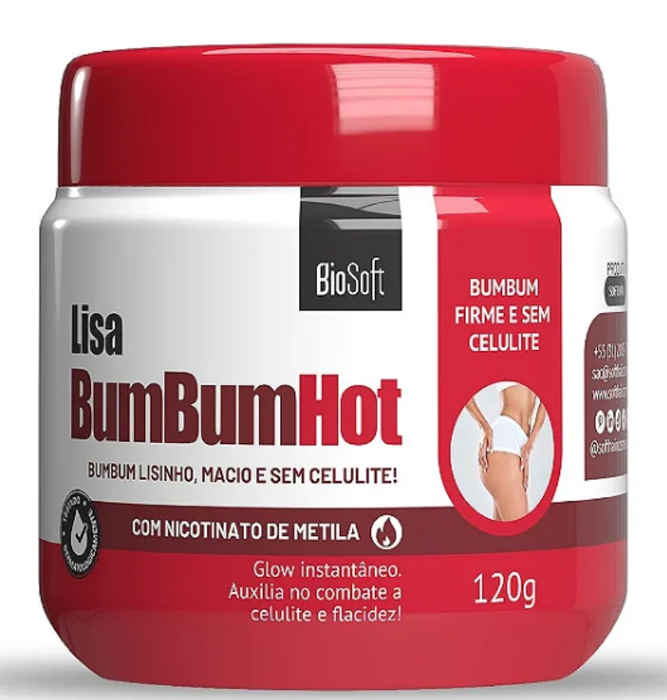 Creme Lisa Bumbum Hot Bio Soft 120g O Lisa BumBum Hot Bio Soft ajuda no fortalecimento e firmeza do tecido da pele, reduz a celulite e promove a quebra da camada de gordura revitalizando a pele e melhorando a aparência e textura geral do seu BumBum de forma super simples e prática. Ainda deixa a pele com uma textura e glow incríveis. Sua ação é hiperemiante (causa aquecimento e vermelhidão da região) devido à função do nicotinato de metila que aumenta a circulação do sangue e é isso que promove e favorece a redução da celulite. Promove a firmeza e da pele. Deixa a pele com Glow instântaneo! Aquece a região por conter nicotinato de metila que age no combate a celulite.