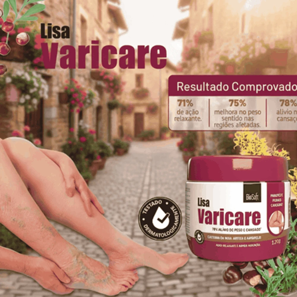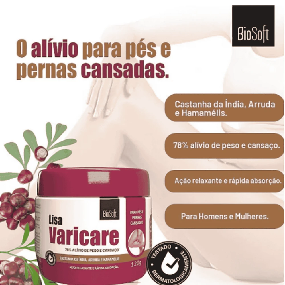 O Creme Lisa Varicare Bio Soft foi desenvolvido especialmente para proporcionar alívio da sensação de peso e cansaço nos pés e pernas. Sua fórmula contém extratos naturais que auxiliam a atividade do sistema circulatório, promovendo sensação imediata de relaxamento e conforto, especialmente em regiões mais afetadas como pés e pernas. Indicado para quem passa longos períodos em pé ou sentado, sofre com inchaço, má circulação ou varizes, podendo ser utilizado tanto por homens quanto por mulheres. Principais benefícios: 78% de alívio da sensação de peso nas pernas 81% de ação relaxante 75% de melhora do desconforto em regiões afetadas por má circulação Ideal para pés e pernas cansadas Auxilia no alívio de dores causadas por inchaço e varizes Ativos da fórmula: Castanha-da-Índia Arruda Hamamélis Produto dermatologicamente testado. Indicação de uso: Indicado para homens e mulheres que buscam alívio da sensação de cansaço e peso nas pernas e pés. Modo de uso: Com a pele limpa e seca, aplique o produto na área desejada e massageie suavemente até completa absorção. Recomenda-se o uso pela manhã e antes de dormir. Teste de irritabilidade: Aplique uma pequena quantidade do produto atrás da orelha ou no antebraço e observe por 48 horas. Caso ocorra vermelhidão ou coceira, suspenda o uso. Não aplicar sobre a pele irritada ou lesionada.