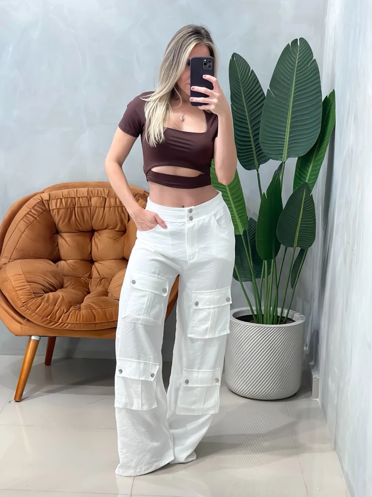 Cropped em Poliamida Manga Curta Decote Quadrado com Recorte Brenda Ref. 1800