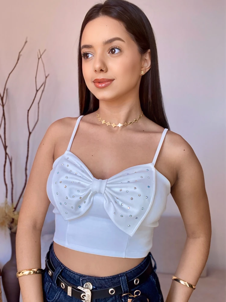 O CROPPED LAÇO STRASS ALÇA FINA é a escolha perfeita para quem busca um look com um design moderno e detalhes em strass, ele é a peça ideal para compor um visual cheio de estilo e personalidade.