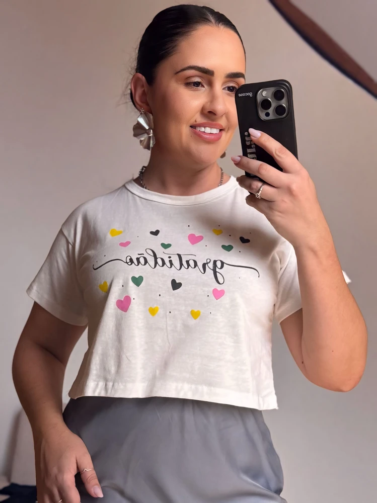 A modelagem é reta, com comprimento cropped, mangas curtas e decote redondo clássico, garantindo um visual moderno e fácil de usar. A estampa frontal com a escrita “Gratidão” combinada com corações coloridos deixa a peça delicada, positiva e cheia de charme.