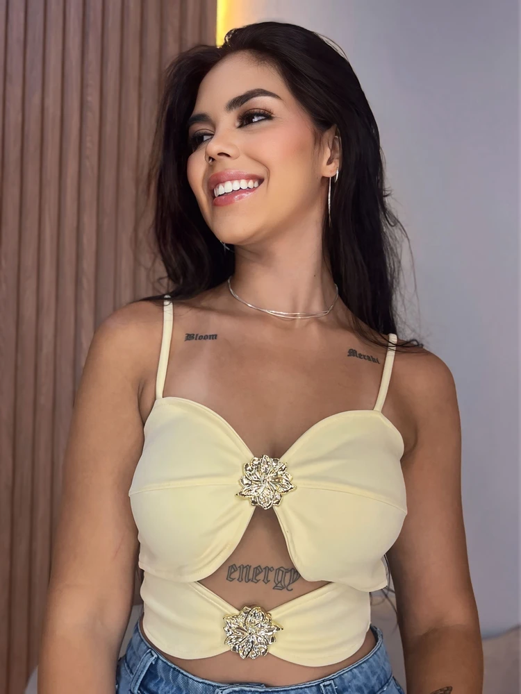 O Cropped Melissa Estruturado com Bojo e Aplicação Floral Metálica é a peça ideal para quem busca um visual moderno, elegante e cheio de personalidade. Com design sofisticado e acabamento impecável, ele valoriza o busto e garante um caimento perfeito no corpo.