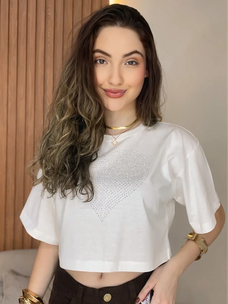 O Cropped T-Shirt Coração com Strass é a peça perfeita para quem ama conforto com um toque glam. Feito em malha macia e com aplicação de strass premium formando um coração central, ele traz brilho elegante e modernidade na medida certa.