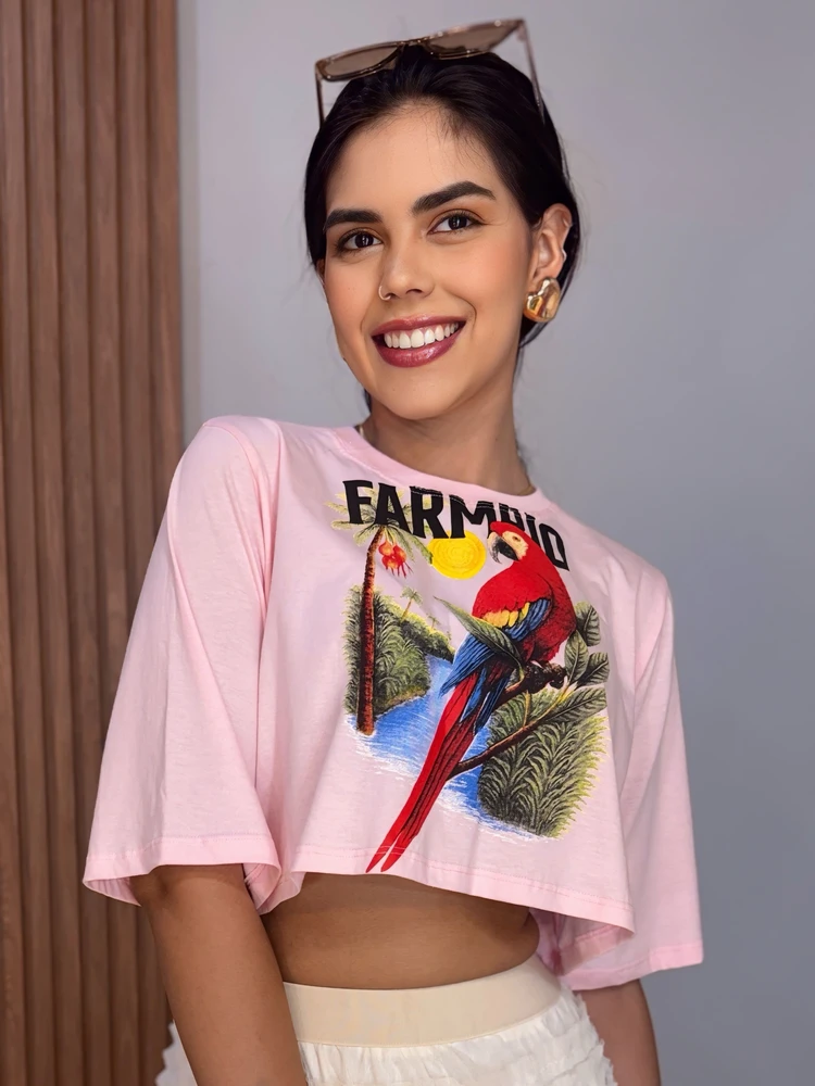 O modelo possui modelagem reta, mangas curtas e decote redondo clássico, garantindo conforto e versatilidade. A estampa frontal de arara, combinada com elementos tropicais e a escrita “Farm Rio”, traz um visual vibrante, criativo e cheio de personalidade — do jeitinho que a gente ama por aqui.