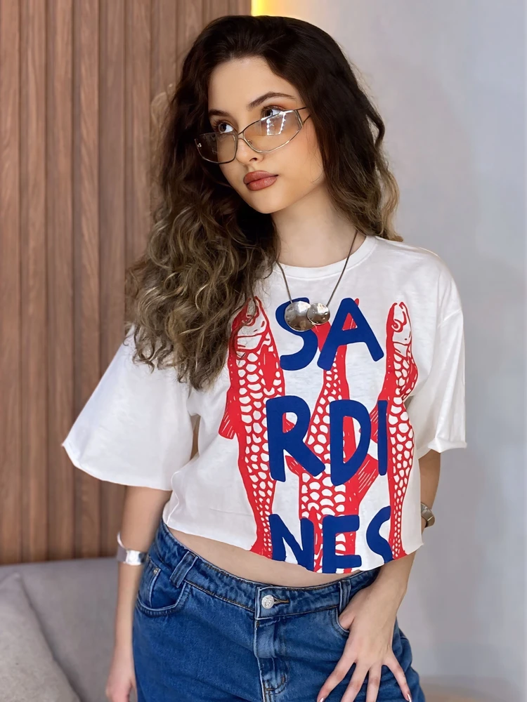 A Cropped T-Shirt Estampada é aquela peça cheia de personalidade que transforma qualquer look básico em algo estiloso e descontraído! Com estampa artística de peixes em estilo ilustrado e listras vermelhas modernas, ela entrega um visual retrô, divertido e super atual — perfeita para quem ama moda criativa.