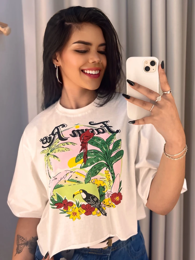 Confeccionado em tecido macio e respirável, o cropped oferece frescor e liberdade de movimentos, sendo ideal para o verão, passeios, viagens, produções casuais e looks do dia a dia.