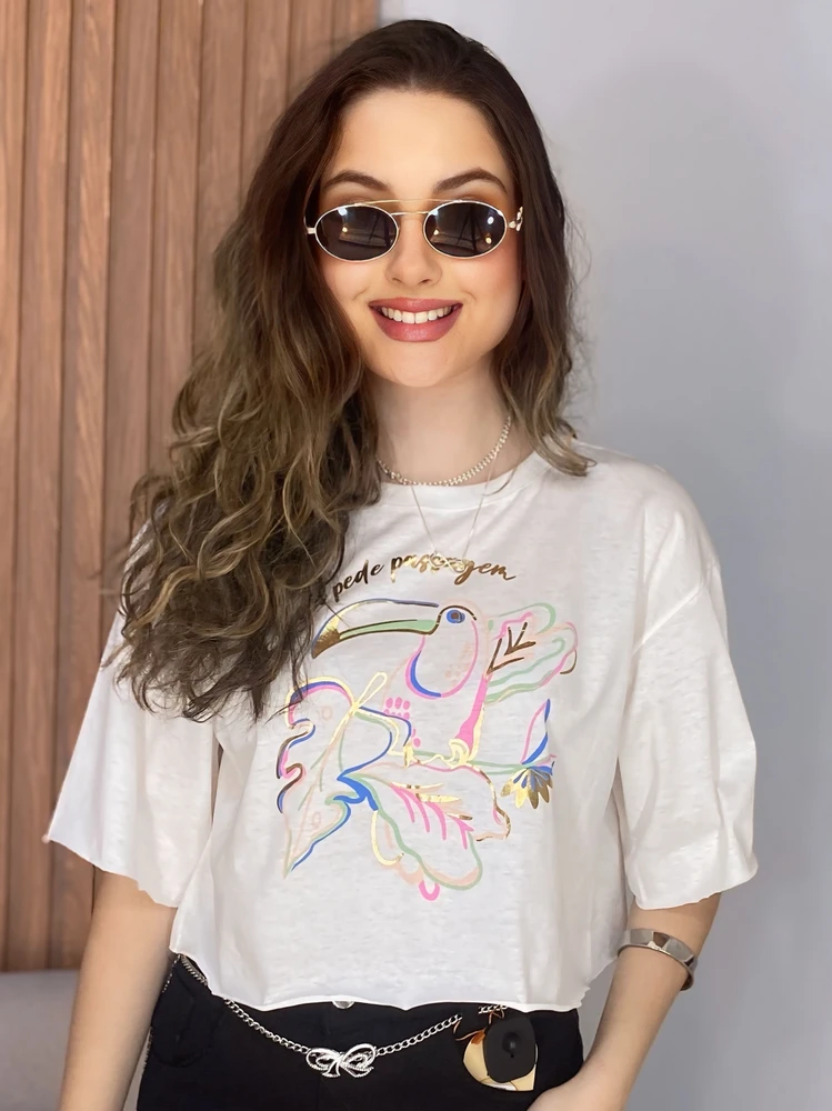A estampa apresenta um tucano tropical super estilizado, com detalhes metalizados em dourado que dão um toque sofisticado e deixam o look ainda mais vibrante. É perfeito para compor produções casuais, urbanas ou fashionistas, combinando com jeans, alfaiataria, saias e shorts.
