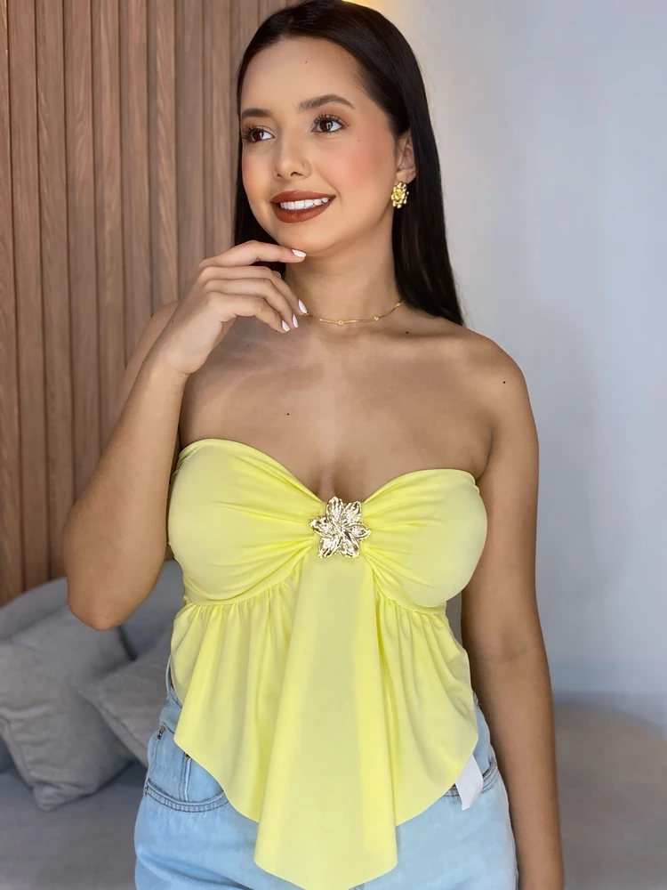 Garanta já o seu e sinta-se poderosa e estilosa com o Cropped Tomara Que Caia Com Fivela Flor Dourada!
