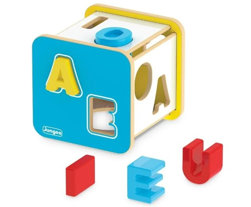Cubo Didático Letras Cubo Didático da Junges em madeira de reflorestamento (MDF) no tamanho 15x15x15cm com pintura atóxica e acabamento em serigrafia. Acompanha 1 kit com 5 peças plásticas coloridas e ergonômicas - letras vogais (A, E, I, O, U). O Cubo Didático é um brinquedo educativo que auxilia as crianças no desenvolvimento da coordenação motora, atenção, percepção e aprendizado das letras e cores.