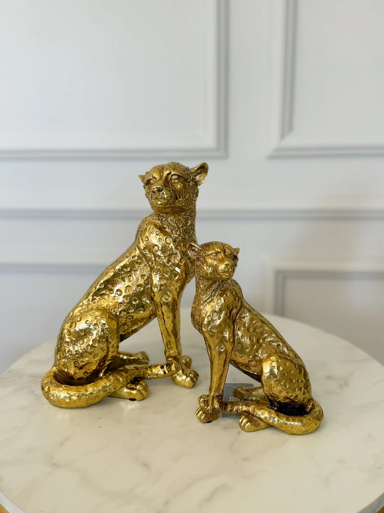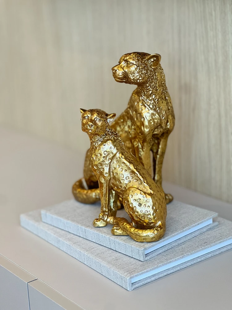 Produzida em polirresina de alta qualidade, a escultura representa um leopardo em posição de atenção, simbolizando força, poder e agilidade. O tom dourado metálico garante destaque e glamour, sendo ideal para decorações contemporâneas, minimalistas ou com estilo maximalista.