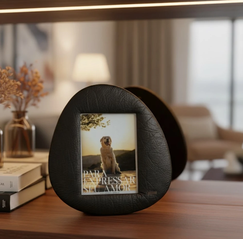 Material e Acabamento: O porta-retrato é revestido em couro preto (ou um material sintético de alta qualidade que imita couro) com uma textura granulada visível, conferindo-lhe um acabamento sofisticado e tátil. A cor preta lhe dá uma aparência elegante.