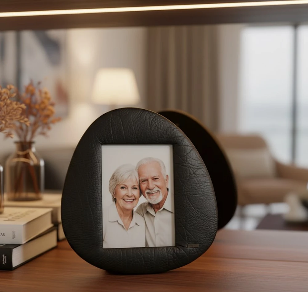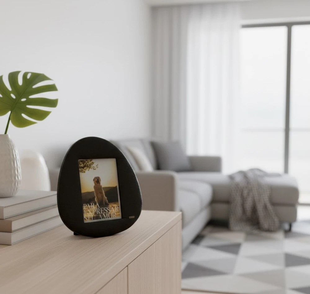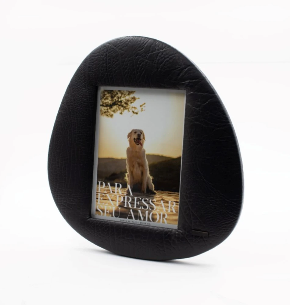 O objeto é um porta-retrato de mesa com um design moderno e orgânico.