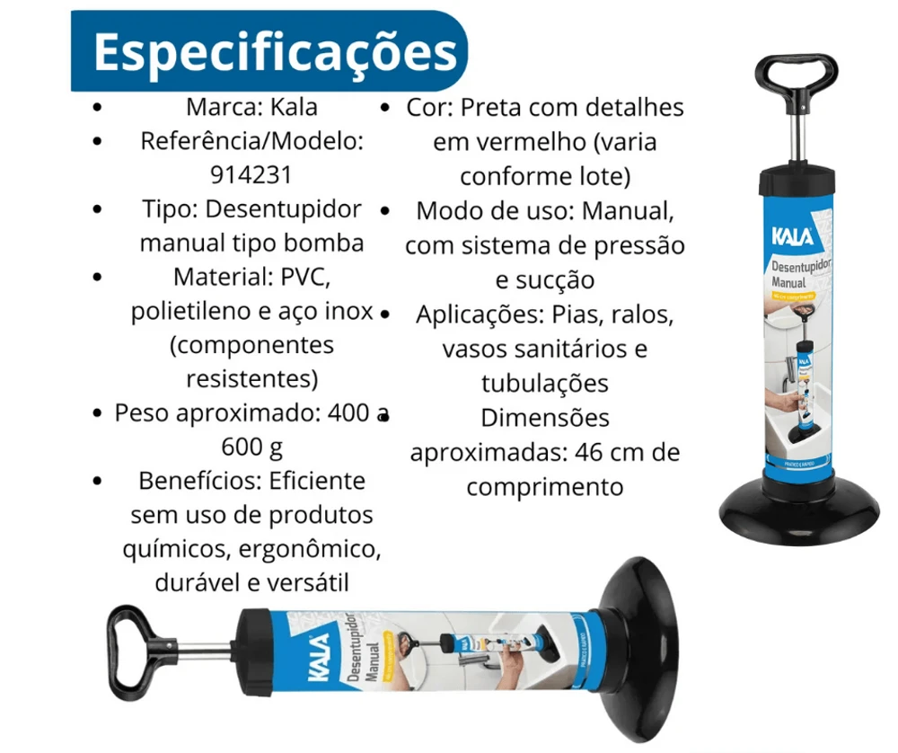 Com o Desentupidor Manual Kala Tipo Bomba da Kala, você possui um desentupidor que transforma a experiência de desentupir em uma tarefa rápida e descomplicada. Invista em tecnologia e desempenho para resolver problemas comuns de encanamentos com eficiência e praticidade.
