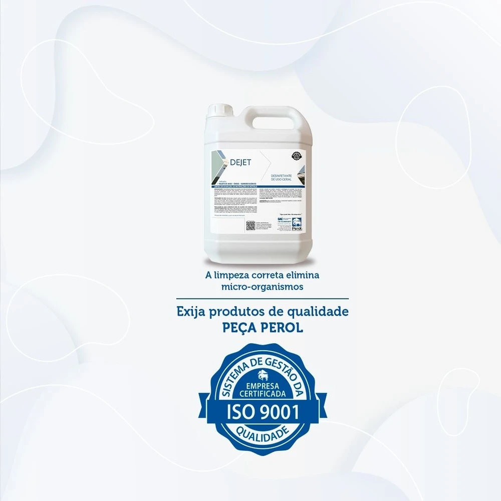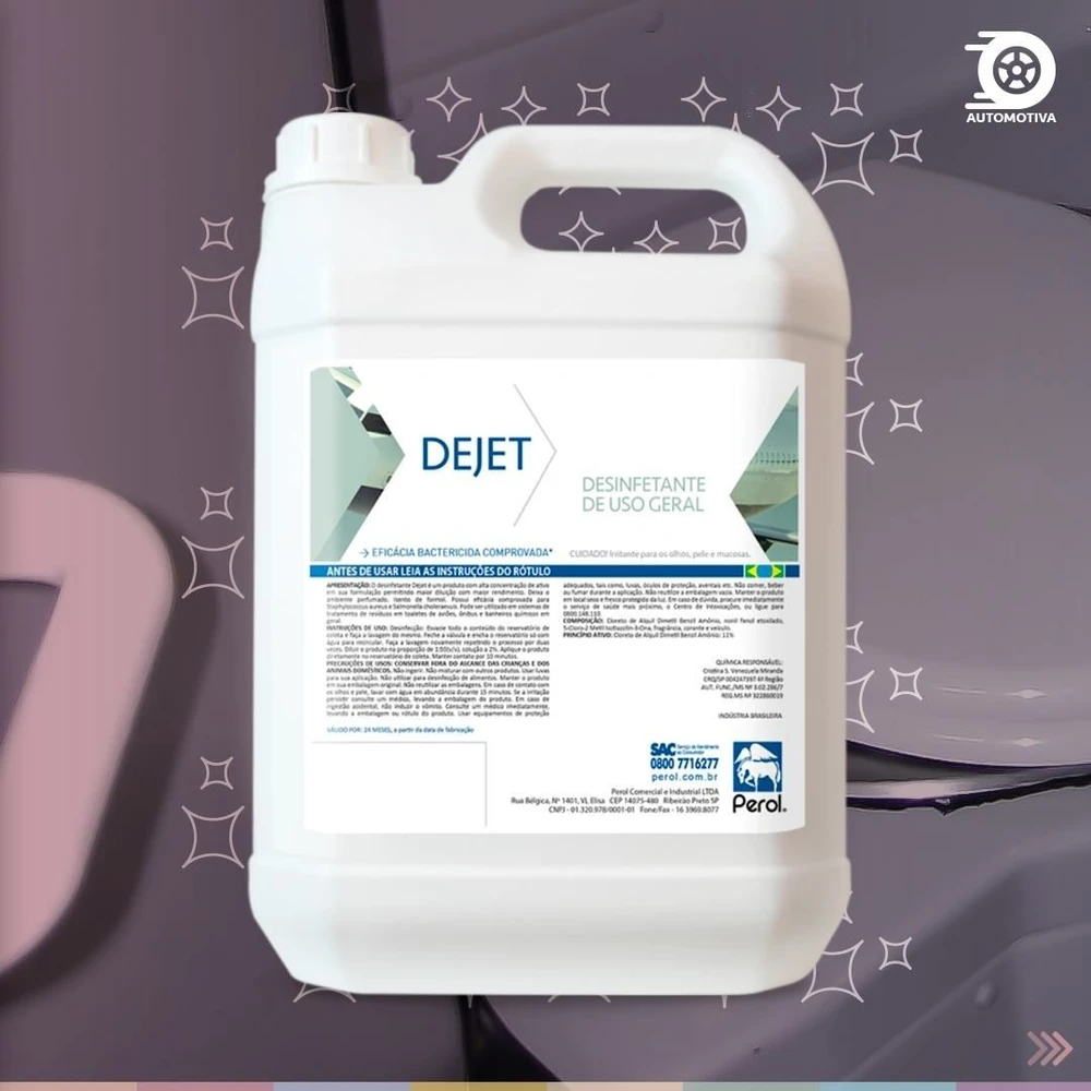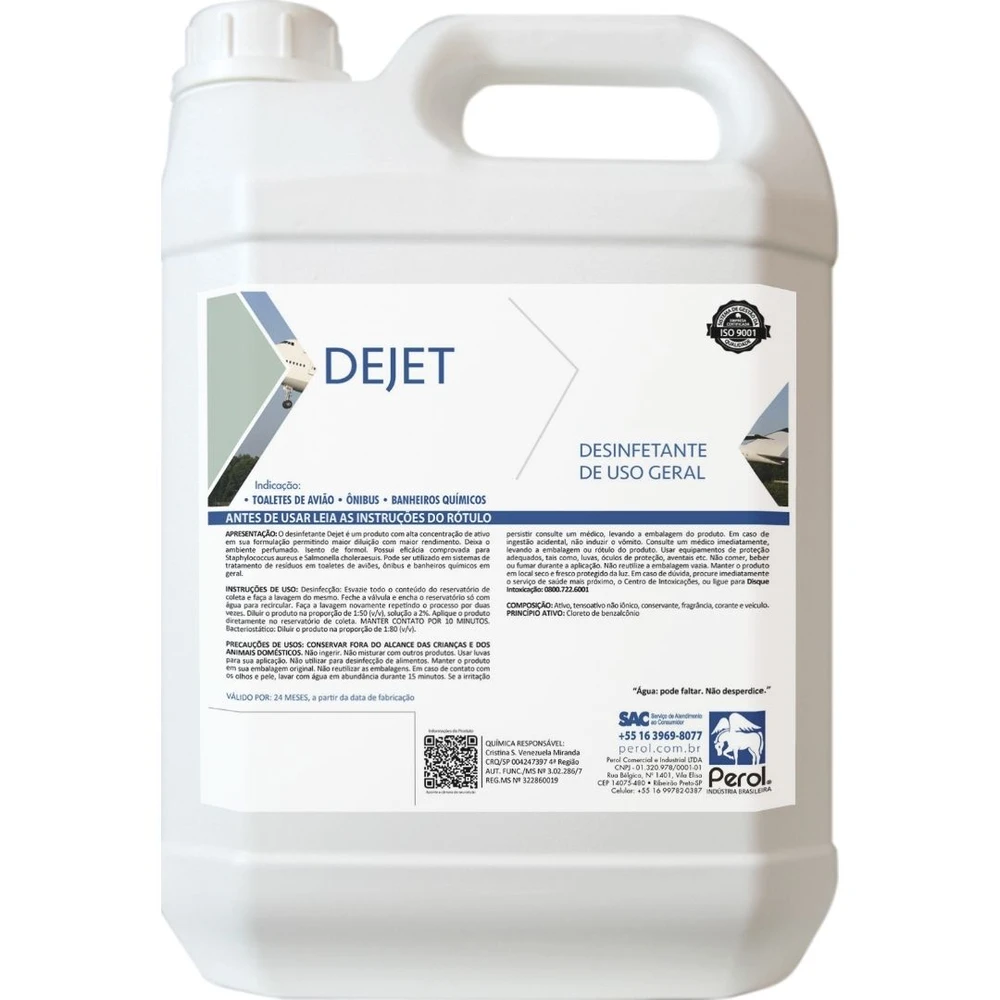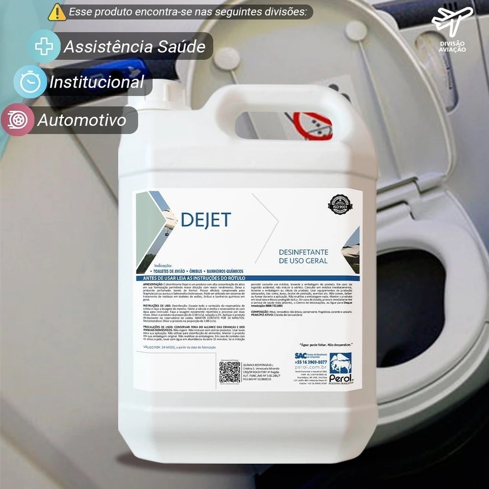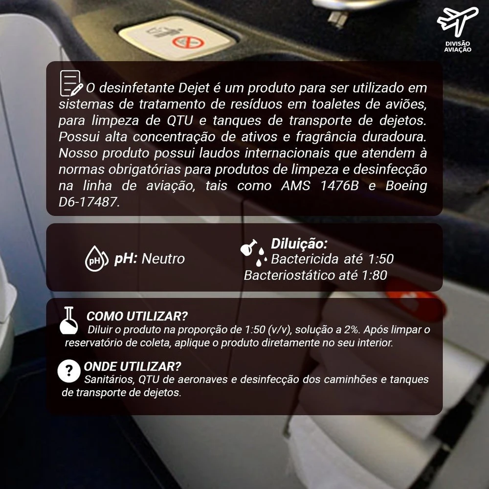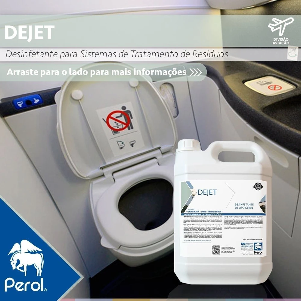 O desinfetante Dejet é um produto para ser utilizado em sistemas de tratamento de resíduos em toaletes de aviões, para limpeza de QTU e dos caminhões e tanques de transporte de dejetos. Possui alta concentração de ativos e fragrância duradoura.