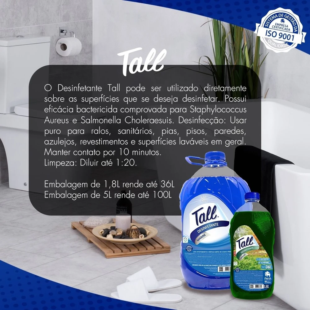 O Desinfetante Tall pode ser utilizado diretamente sobre as superfícies que se deseja desinfetar. Possui eficácia bactericida comprovada para Staphylococcus Aureus e Salmonella Choleraesuis.