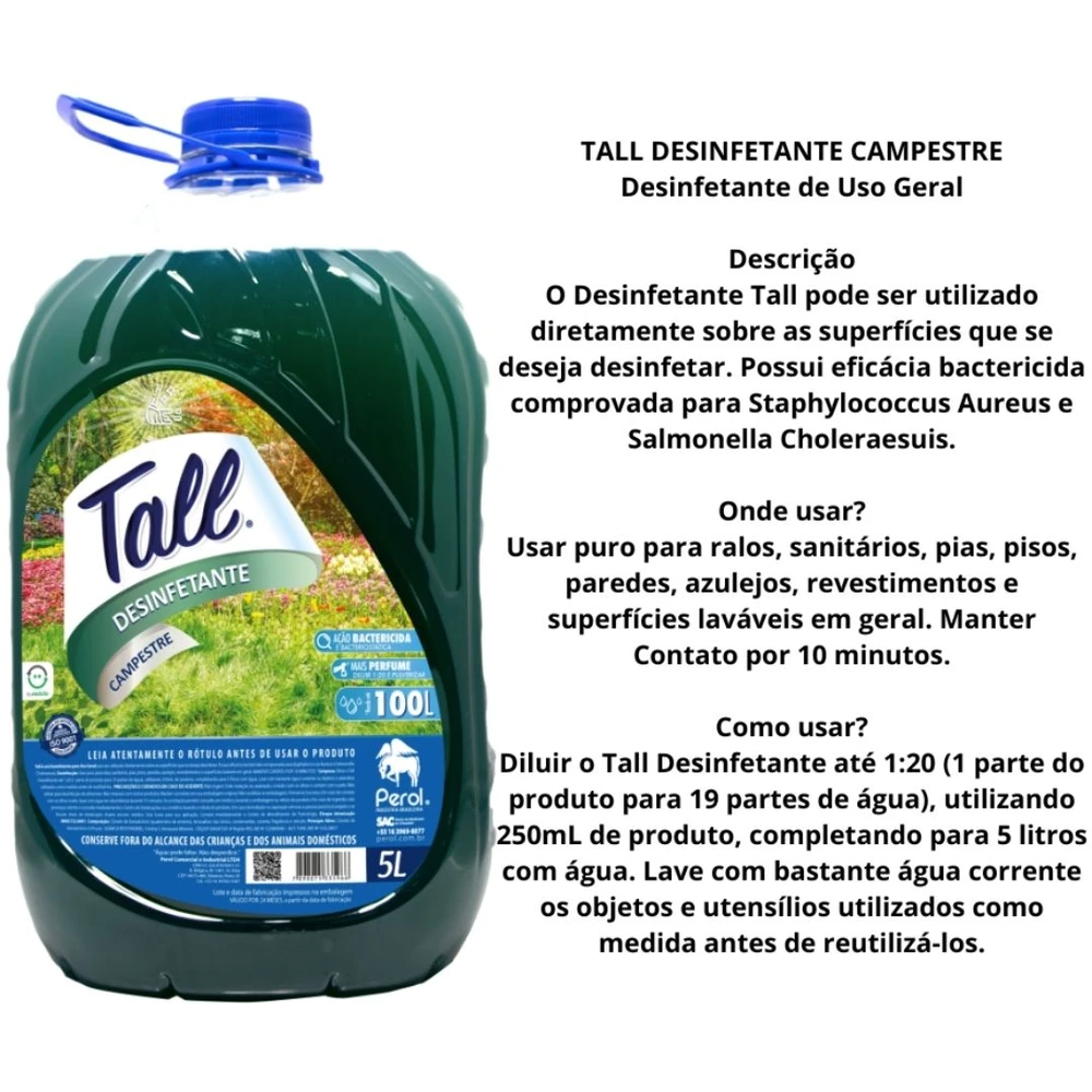 Diluir o Tall Desinfetante até 1:20 (1 parte do produto para 19 partes de água), utilizando 250mL de produto, completando para 5 litros com água. Lave com bastante água corrente os objetos e utensílios utilizados como medida antes de reutilizá-los.