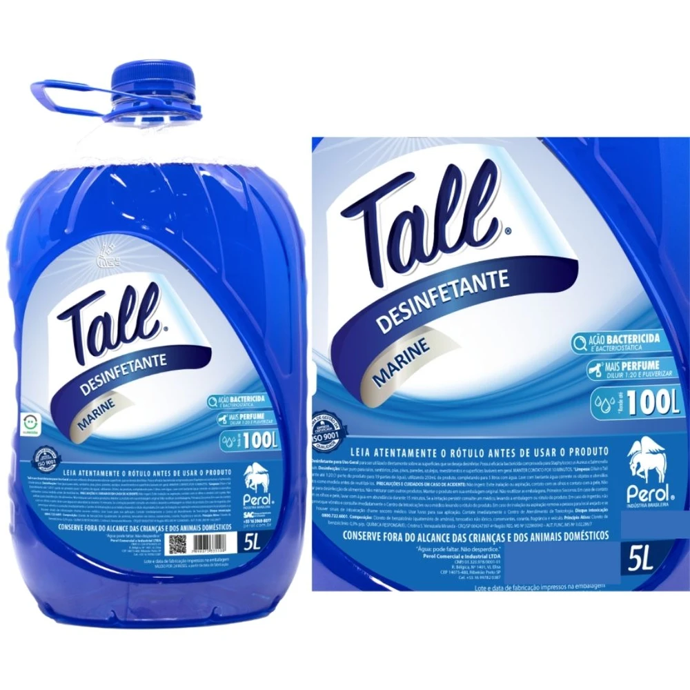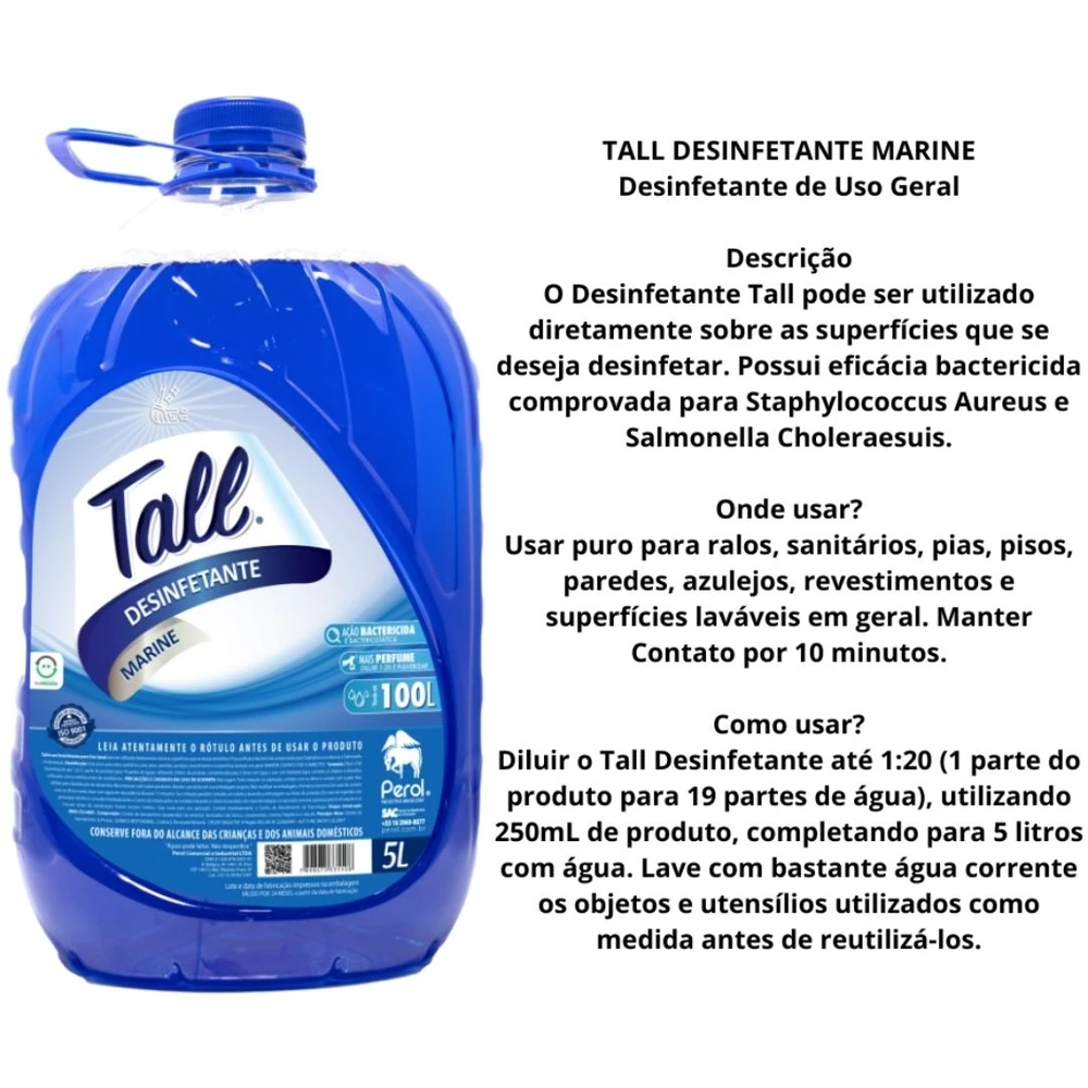 O Desinfetante Tall pode ser utilizado diretamente sobre as superfícies que se deseja desinfetar. Possui eficácia bactericida comprovada para Staphylococcus Aureus e Salmonella Choleraesuis.