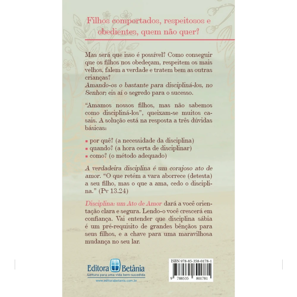 A disciplina sábia é um pré-requisito de grandes bençãos para seus fihos. Filhos comportados, respeitosos e obedientes, quem não quer? Mas será que isso é possível? Como conseguir que os filhos nos obedeçam, respeitem os mais velhos, falem a verdade e tratem bem as outras crianças? Disciplina - um Ato de Amor dará a você orientação clara e segura. Lendo-o, você crescerá em confiança. Vai entender que disciplina sábia é um pré-requisito de grandes bençãos para seus fihos e a chave para uma maravilhosa mudança no seu lar.