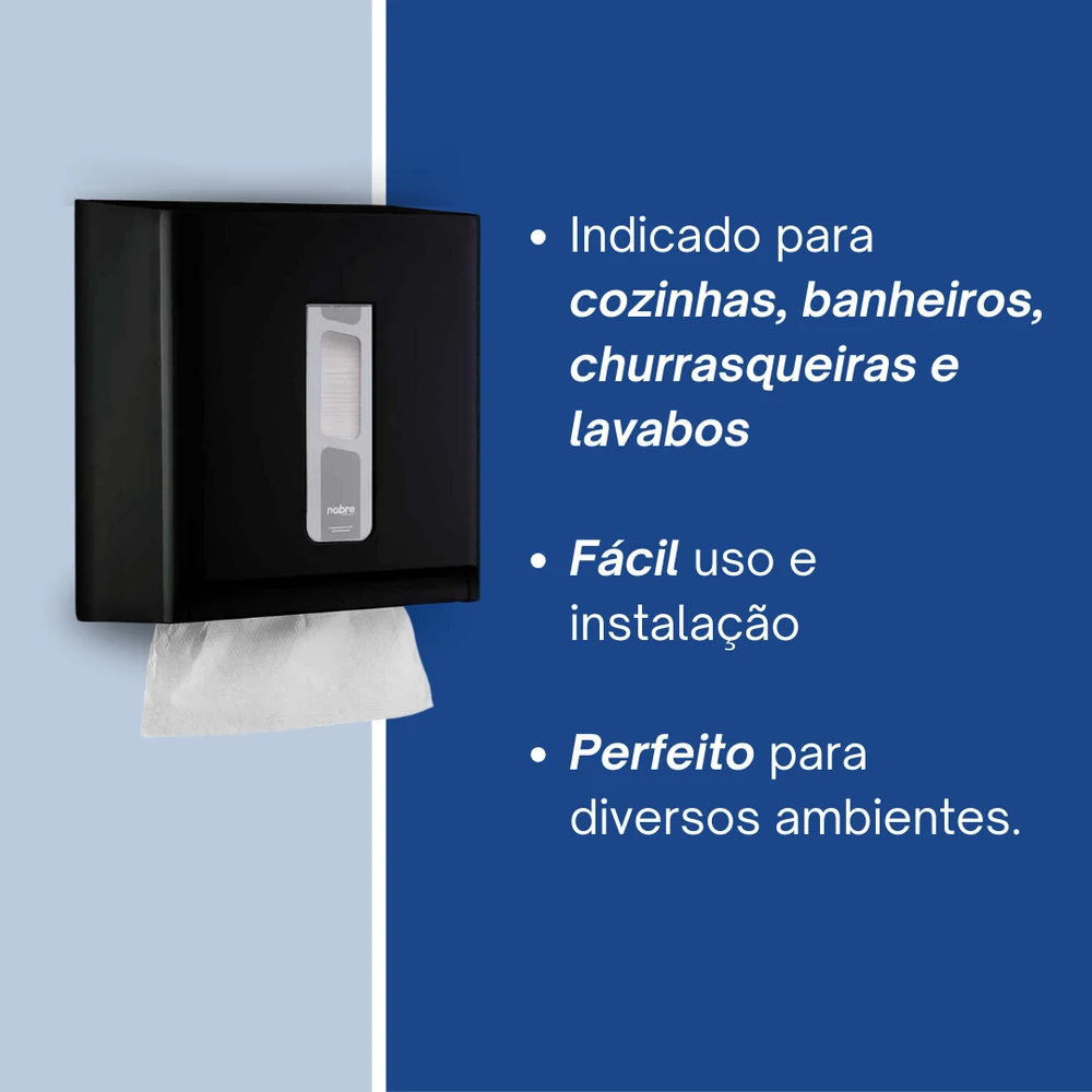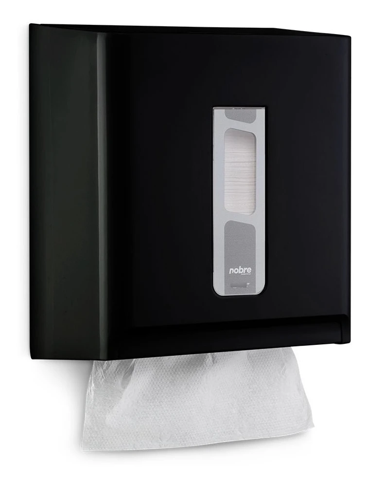O Dispenser para Papel Toalha Nobre é indicado para cozinhas, banheiros, churrasqueiras e lavabos. Panos de prato podem acumular e espalhar bactérias para panelas, pratos, copos, talheres e utensílios domésticos devido ao seu uso na secagem das mãos. Utilizar toalhas descartáveis assegura mais higiene e praticidade no uso e na instalação. Ideal para diversos ambientes. Cor preto.Contém: Dispenser, 4 parafusos, 4 buchas.DIMENSÕESPeso líquido produto: 620gPeso bruto produto: 698gMedida produto (CxAxL): 24,4cm x 27,9cm x 13,3cmCOMPOSIÇÃO: Polipropileno (PP), poliestireno (PS)INSTALAÇÃO: Pressione o botão para abrir. Abra com cuidado, puxando a parte frontal para a frente e para baixo. Fixe o dispenser na parede utilizando os parafusos que acompanham. Abasteça com papel interfolhas, feche o dispenser e está pronto para uso.PRECAUÇÕES: Na instalação, verifique a existência de encanamentos na parede onde o dispenser será instalado. Não use água sanitária ou soluções cloradas na higienização do produto. Para limpeza, utilize pano úmido e detergente neutro. Evite materiais abrasivos.