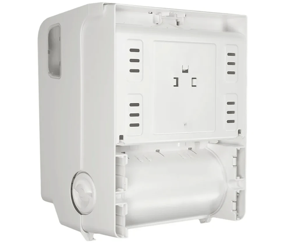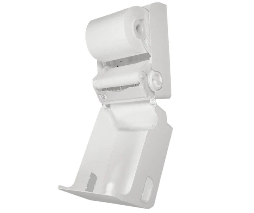 Dispensador para toalhas de papel em rolo/bobina. Construído com materiais duráveis e de alta resistência mecânica, protegido de partes cortantes ou acesso ao mecanismo interno e com visor nas laterais para identificação do nível de papel para abastecimento. Equipamento para fixação na parede. Sistema auto corte - que pode ser acionado através do papel que é puxado pelo usuário ou girando a manopla lateral.