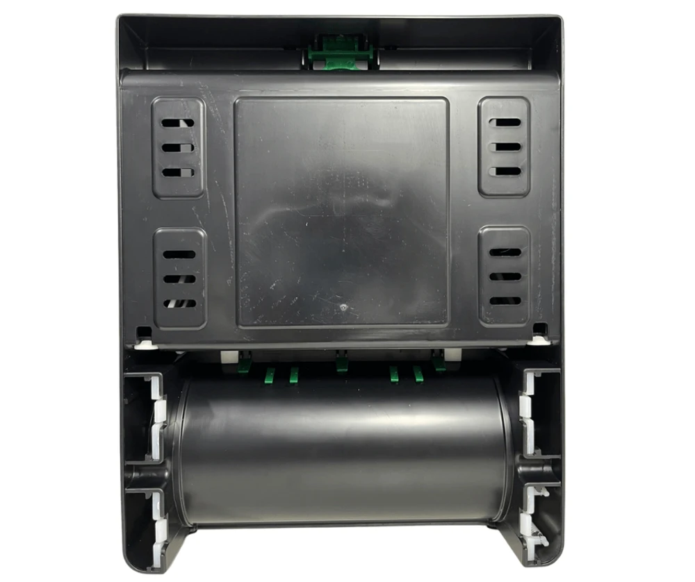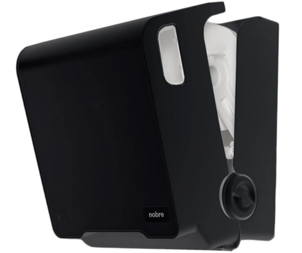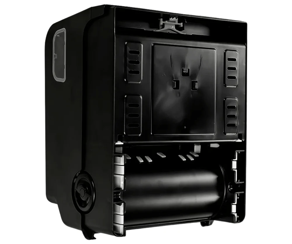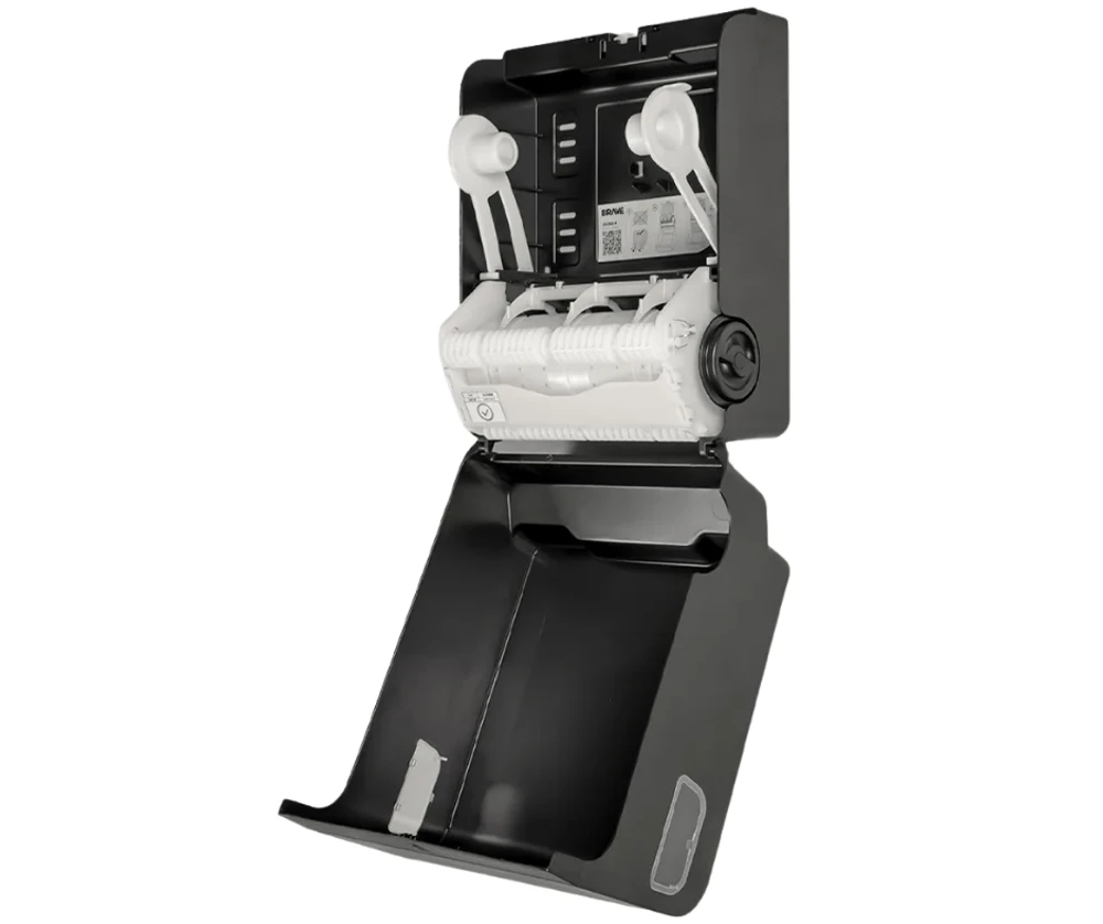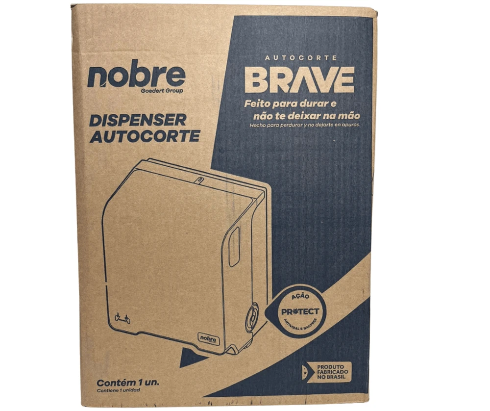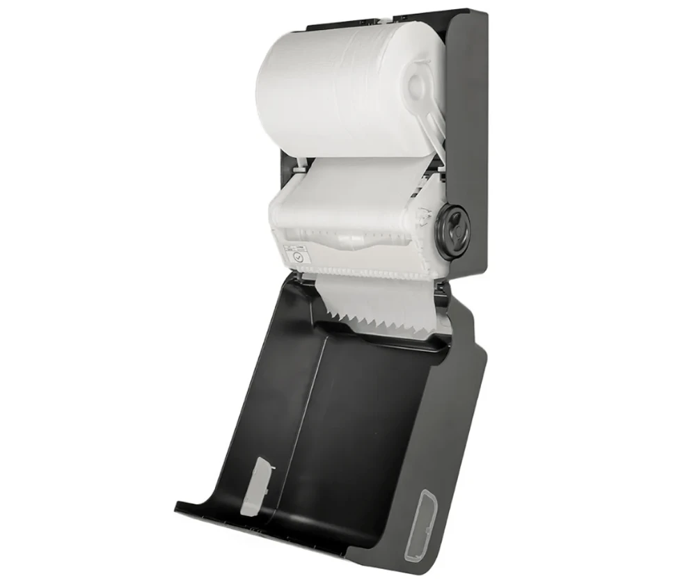 Dispensador para toalhas de papel em rolo/bobina. Construído com materiais duráveis e de alta resistência mecânica, protegido de partes cortantes ou acesso ao mecanismo interno e com visor nas laterais para identificação do nível de papel para abastecimento. Equipamento para fixação na parede. Sistema auto corte - que pode ser acionado através do papel que é puxado pelo usuário ou girando a manopla lateral.